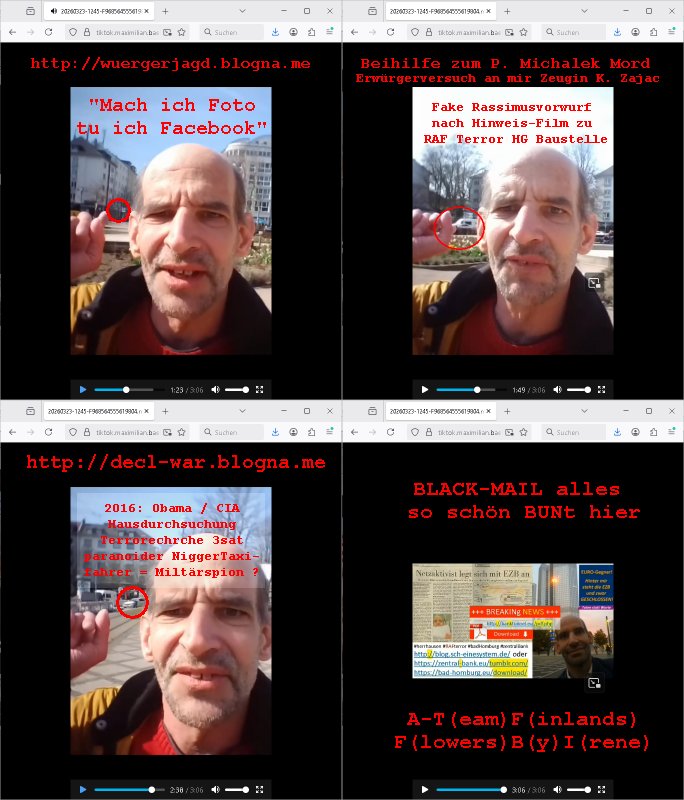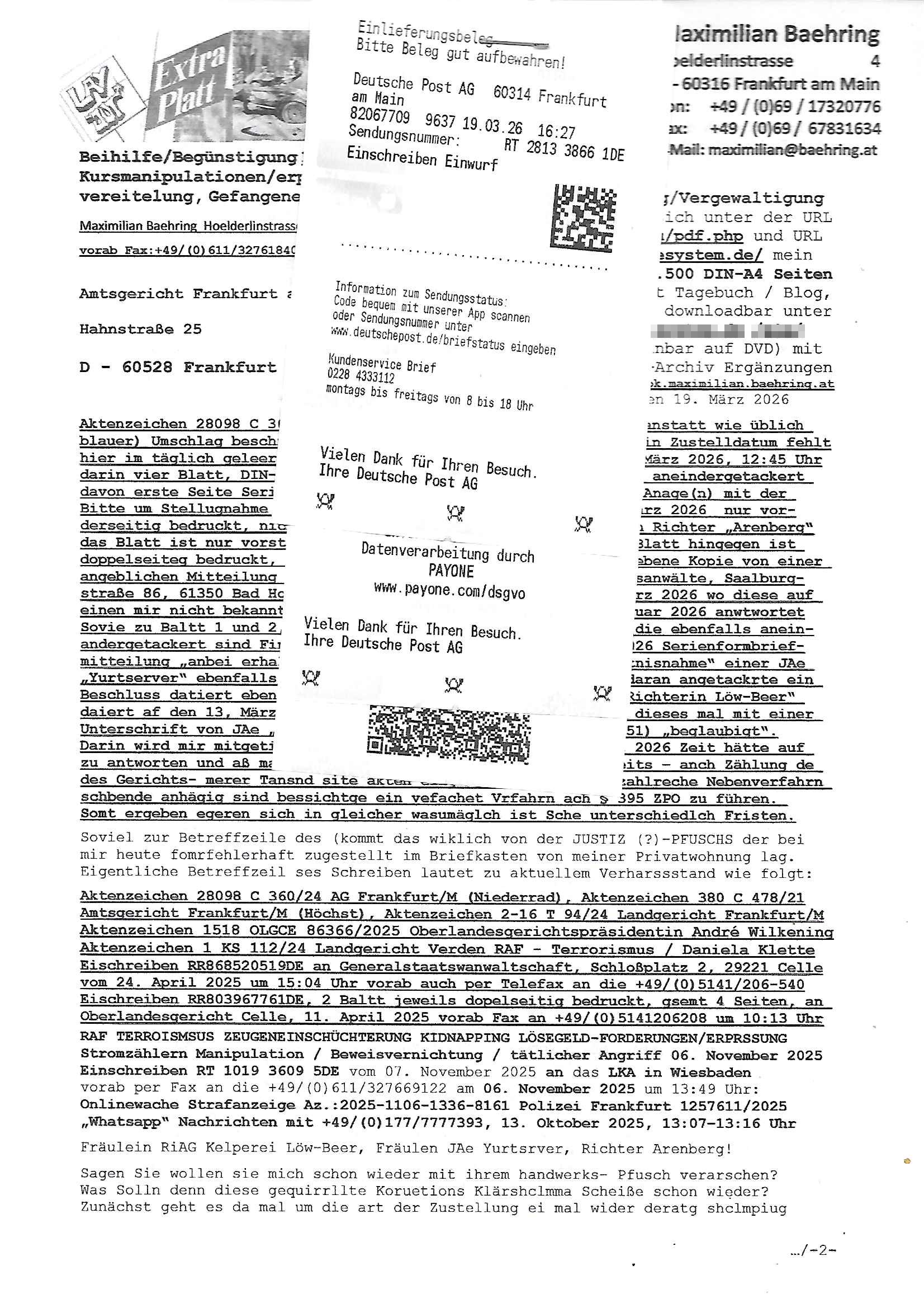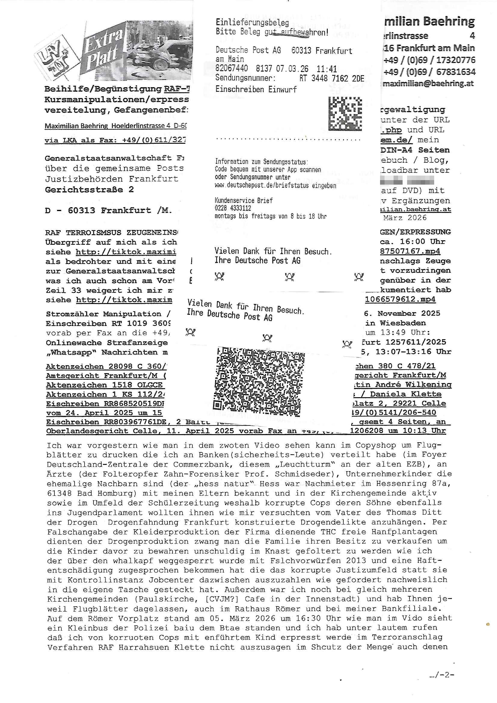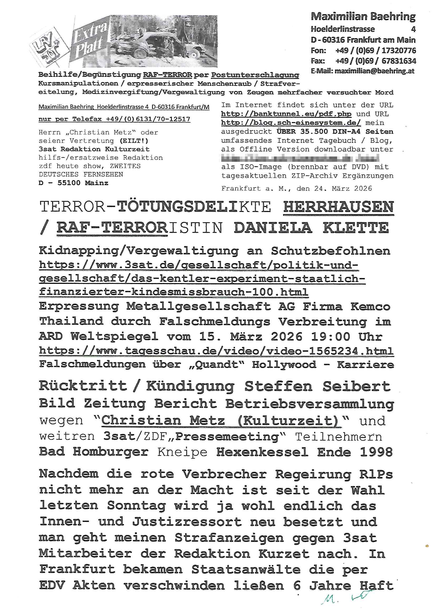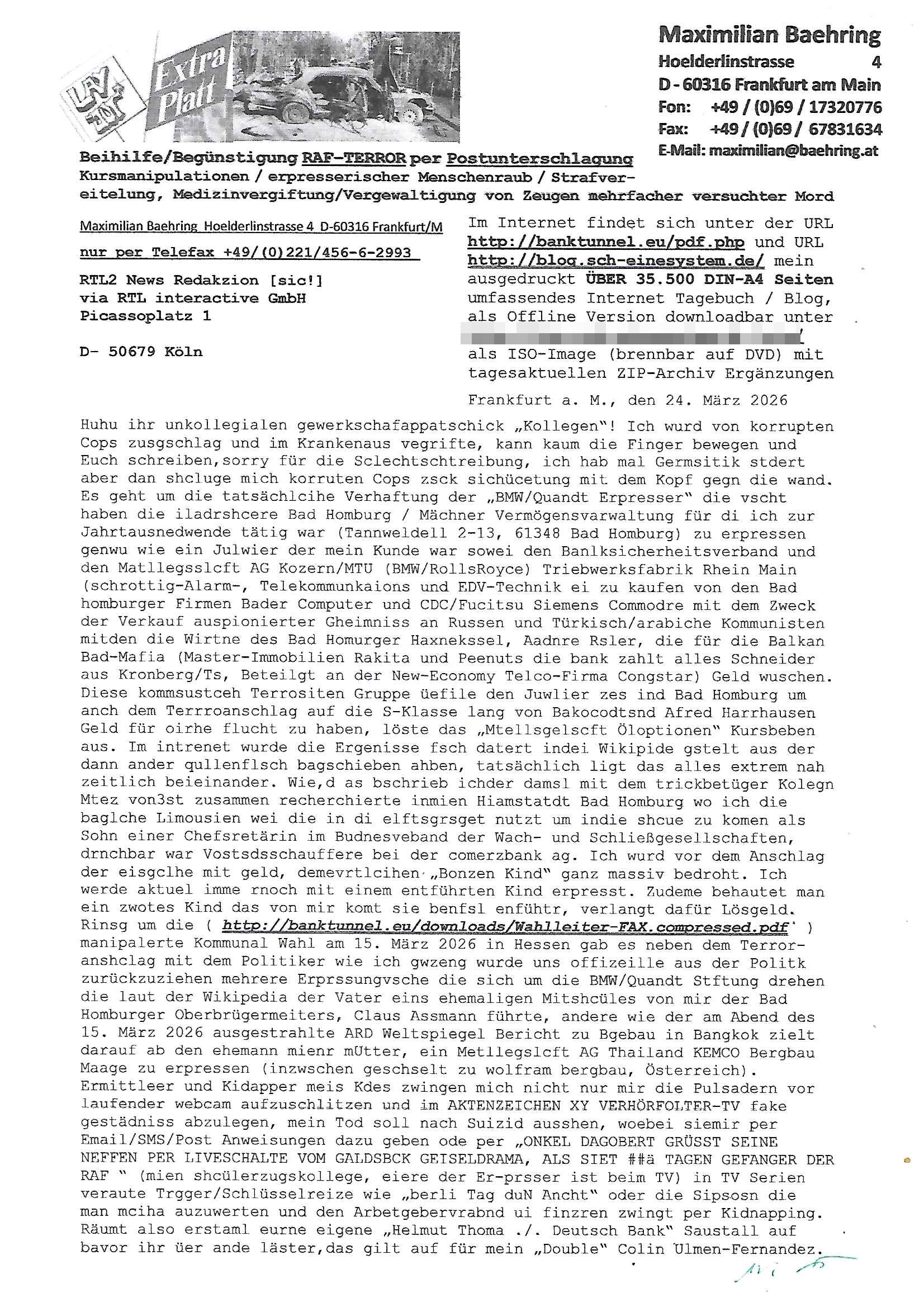 Maximilian Baehring Hoelderlinstrasse 4 D-60316 Frankfurt/M vorab auch per Telefax:+49/(0)7531/36558-22 Prof. Dr. Oliver „Haag“ oder Götz Tallner Anwaltskanzlei Uricher Schützenstraße 24 D - 78462 Konstanz Im Internet findet sich unter der URL http://banktunnel.eu/pdf.php und URL http://blog.sch-einesystem.de/ mein ausgedruckt über 35.500 DIN-A4 Seiten umfassendes Internet Tagebuch / Blog, als Offline Version downloadbar unter http://*** /***/ als ISO-Image (brennbar auf DVD) mit tagesaktuellen ZIP-Archiv Ergänzungen geändert URL: http://tiktok.maximilian.baehring.at Frankfurt am Main, den 27. März 2026 Ihr Dikatzeichen 57/16hö, damals noch Uricher & Coll. Reichenaustraße 5 D-78467 Konstanz angebliche Mandanten Bähring, Bernd und Ilse–Marie, Im Möösle 17, D-78343 Gaienhofen Schreiben vom 12. Mai 2016 http://banktunnel.eu/sch-einesystem/20160512.htm Aktenzeichen 10 ARDB/16 ltdr OStA Konstanz 47 Js 25475/16 Statsanwaltschaft Konstanz Schreiben vom 21. November 2016 http://banktunnel.eu/sch-einesystem/20161121.htm Kidnapper/Erpresservideo vom 15. März 2026, 19:00 Uhr ARD/dasErste „weltspiegel“ Metallgesellschaft/KEMCO Thailand https://www.tagesschau.de/video/video-1565234.html Einschreiben RT148977875DE(AT) 23. Dezember 2025 10:44 Uhr per Fax an +43(0)6562413728 Metallgesellschaft/wolfram Bergbau Österreich wo mein Vater in der Folgezeit nach Siam bis zur Rente Geschäftsführer war http://banktunnel.eu/sch-einesystem/20251223.htm Kursmaniplautioneen/Terroismus/ Zeugenschutz Code „EDELMETALL“ Einschüchterungs EMail durch die Kanzlei Flöther & Wissing, München vom 25. März 2026 12:47 Uhr die versendethaben abstreitet siehe Fax an Bayrisches LKA +49/(0)89/1212-2356 vom 26. März 2026 um 08:13 Uhr http://banktunnel.eu/sch-einesystem/20160512.htm Aktenzeichen 1518 OLGCE 86366/2025 Oberlandesgerichtspräsidentin André Wilkening Aktenzeichen 1 KS 112/24 Landgericht Verden RAF - Terrorismus / Daniela Klette Eischreiben RR868520519DE an Generalstaatswanwaltschaft, Schloßplatz 2, 29221 Celle vom 24. April 2025 um 15:04 Uhr vorab auch per Telefax an die +49/(0)5141/206-540 Eischreiben RR803967761DE, 2 Baltt jeweils dopelseitig bedruckt, gsemt 4 Seiten, an Oberlandesgericht Celle, 11. April 2025 vorab Fax an +49/(0)5141206208 um 10:13 Uhr Aktenzeichen 28098 C 360/24 AG Frankfurt/M (Niederrad), Aktenzeichen 380 C 478/21 Amtsgericht Frankfurt/M (Höchst), Aktenzeichen 2-16 T 94/24 Landgericht Frankfurt/M RAF TERROISMSUS ZEUGENEINSCHÜCHTERUNG KIDNAPPING LÖSEGELD-FORDERUNGEN/ERPRESSUNG Stromzählern Manipulation / Beweisvernichtung / tätlicher Angriff 06. November 2025 Einschreiben RT 1019 3609 5DE vom 07. November 2025 an das LKA in Wiesbaden vorab per Fax an die +49/(0)611/327669122 am 06. November 2025 um 13:49 Uhr: Onlinewache Strafanzeige Az.:2025-1106-1336-8161 Polizei Frankfurt 1257611/2025 „Whatsapp“ Nachrichten mit +49/(0)177/7777393, 13. Oktober 2025, 13:07–13:16 Uhr Sie staats- und demokratiefeindliche Budnwehr-Uni Terroristen- Betrügerbande! Ich hab im Betreff aufgeführt daß wri shcon mehrfach mitiender zu run hatten, dab haben sie mich und Altbundepräsudentn auf das kräftigste verarschte und glaben sie mir, Fluchmöglichkeit näher zur Grenze wird Sie nicht vor Straf-verfolgung retten, ich war an ner Scheizer Ausnlandsschule und hab gite Ver-bindung zur Diplomatie der Nachbarstaaten wie zu Flighafen Abflugkontrollen. Ich werde dafür sogren daß man sie in ein Land verschkleppt woe man sie udnirhe anaghölrgen erst foltert, vastümmelt und vergeleigte bervor man sie dann hin-richtet, genasu woe ie am das mit meirnfmile vorhate und teils gemcht hat. Ich bin mir zuiemlch sind die bis af die Knochen korrupten Straverfolgusgbehörden des Bundlandes Baden-Württeberg berist vor jahren auf den Verdacht hingewiesn zu haben daß sie Geldwäsche betreiben für Terroisten Kidnapper Wirtschaftkimnelle und dabei erpsserisch veruichen den Namen/Ruf meinr Fmile zushcädgen und der Firmen die sie betreibt oder leitet. Und ich kan darüebr den nchwsi führen aber ich muß mich kurz fassen den ich muste hauet nacht erstmal den bisher schwersten DDOS angiff auf meine Beweismittel Online-Tagebuch-Blog Webserver abwehren. Dieser folget direkt anchdem ich weitere „professoren“ Kolegn ihres bsi af die Knochen korruten Kartells de rpolze gemdelet udnas dr JoanlsteKolgen und Anti-Korrutiosn-NGOS öffentlich gemacht hatte. Hinter den Angrffen stecken Täer die nicht gapeztert Limusisnen von Vorständen duscher großbanken inde luft stergetn ineir ahistastdt sodenr auch den Sturz mehreer Adelsdynastien in konstitution-ellen Moarchen bachsichten wie in Großbrittannien udndeemKögrich Siam. Zduem die globale tels ias srscbien und Obslcoke achshctendinsten bestehende Mafia welche evrchte deas westuopsäceh Bank- ud Börsnsystem zu schädigen, „Euro-Krise“ usw., ihre galche Mandantin meine Mutter war Chefstekretärin beim Bundesvabd der Wach- und Schließ-sgesellscften, zuständig für die geld- udnwettratsporte Sicherheit. Ich slebr biniern der aus Gründen der sichehrit ungenant geleiebn Erfidner des WWW/intrenets und der Browser udnadner Zusgnsofwtare, auch IPv6 kommt von mir. Mien patenta ist Witerpsort Olypiamdeaillengweinnerin ihr Ehemann der Trazuege meir Eltren Gerstastrasboffizer der Luftwaffe, siet seinem alstebridgeten aus-scheiden aus der Führung einer Jagdbomberstaffel NTAO diplat, zutet in Brüssel. Man hat mir signalisiert (achten sie mal auf die in Blog verlinkten Luftwaffe Berichte) von Kräften zshcrcher mreen aus daß mandie shcuzer voll hat mit der korrution der zu Unrecht im Amt efidlciehn „reGIERung von #fotzefritz Me_z“. nicht nur inerhlab de rnato, auch die in ale Zetungen und Sndrn verieten und Androhungen eines rsschen Atomwaffeneintzes dcuh Putin gehen auf meine Kräfte zurück. Ich hab imMoment eieglch bessres zu tun als mich mit Trickbetrügern wie ihnen im Inland herumzuärgern,wie sie mien Onlie tagebuch / Webste Blog uter den imi