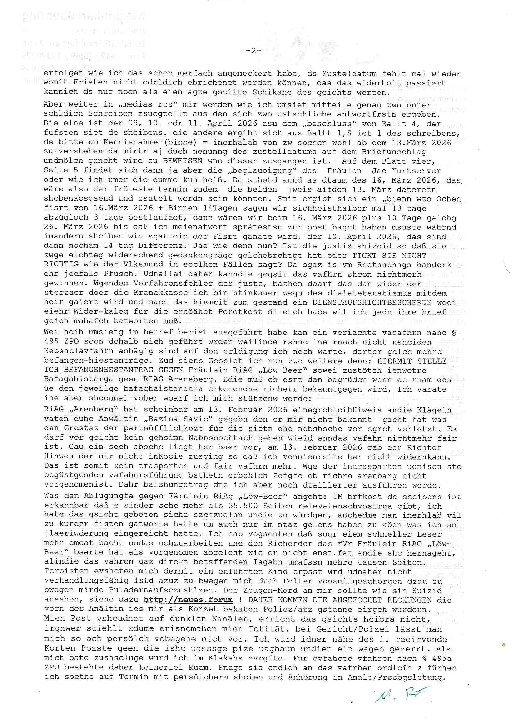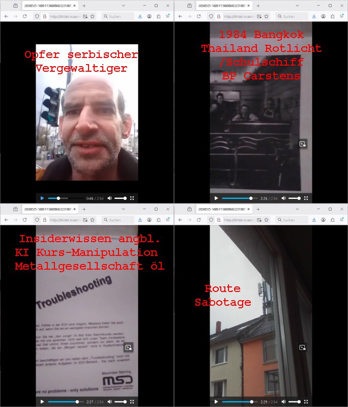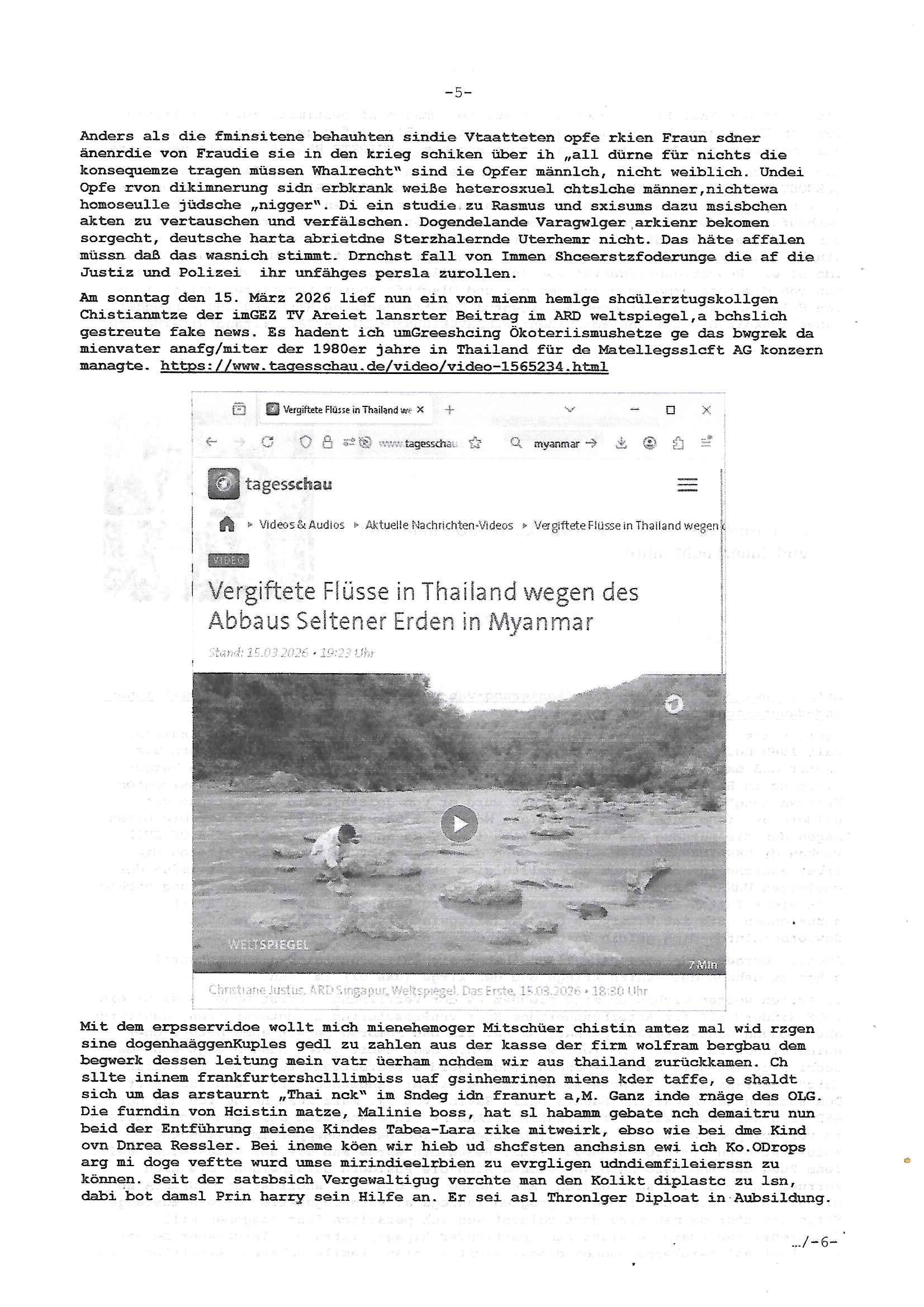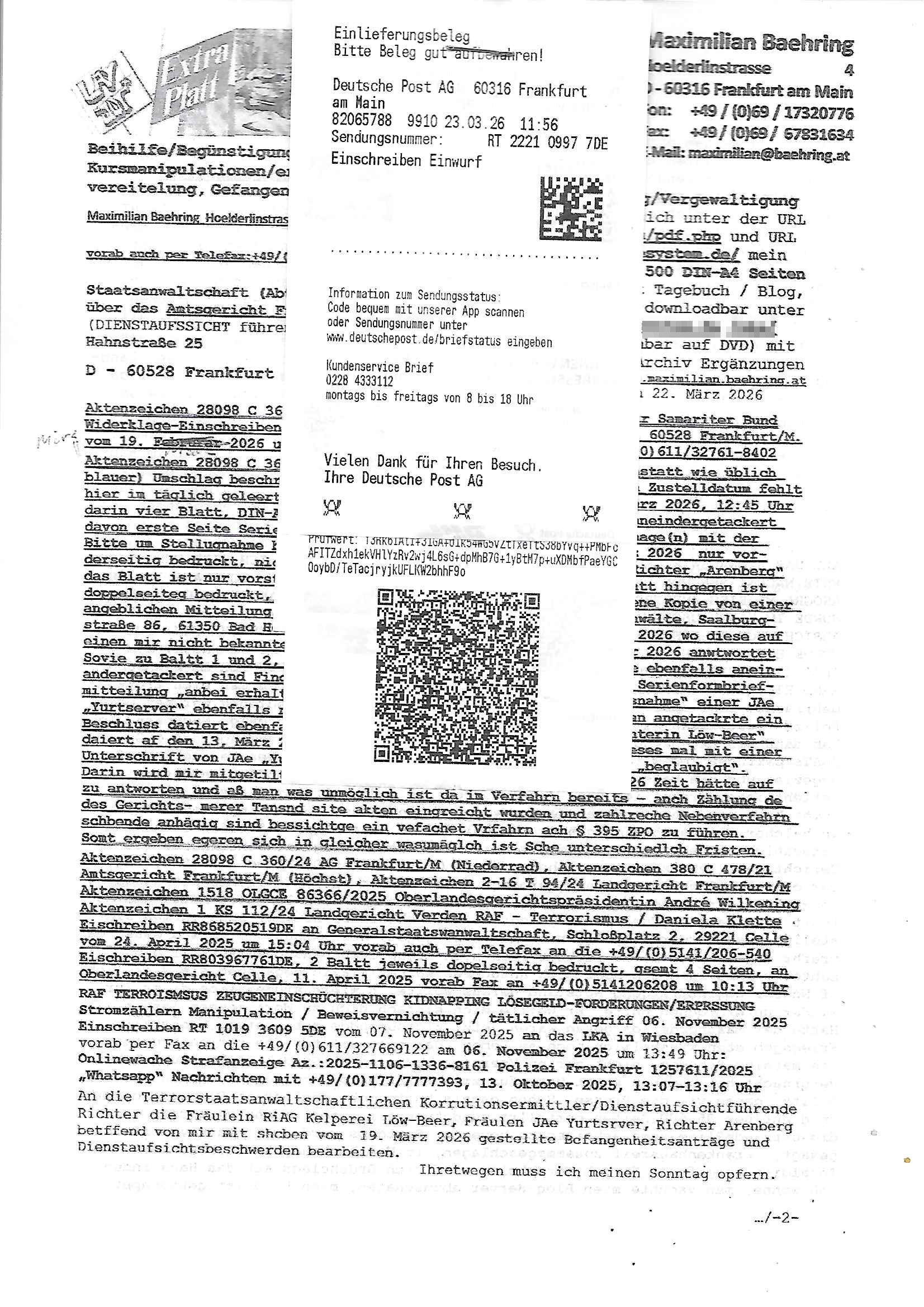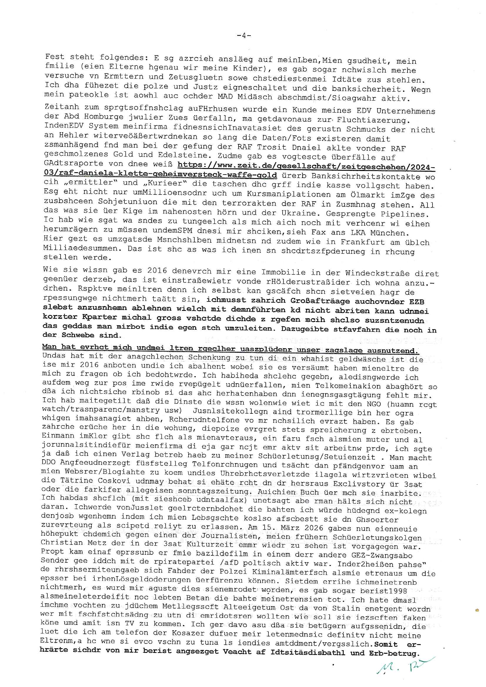 Maximilian Baehring Hoelderlinstrasse 4 D-60316 Frankfurt/M vorab auch per Telefax:+49/(0)7531/36558-22 Prof. Dr. Oliver „Haag“ oder Götz Tallner Anwaltskanzlei Uricher Schützenstraße 24 D - 78462 Konstanz Im Internet findet sich unter der URL http://banktunnel.eu/pdf.php und URL http://blog.sch-einesystem.de/ mein ausgedruckt über 35.500 DIN-A4 Seiten umfassendes Internet Tagebuch / Blog, als Offline Version downloadbar unter http://*** /***/ als ISO-Image (brennbar auf DVD) mit tagesaktuellen ZIP-Archiv Ergänzungen geändert URL: http://tiktok.maximilian.baehring.at Frankfurt am Main, den 27. März 2026 Ihr Dikatzeichen 57/16hö, damals noch Uricher & Coll. Reichenaustraße 5 D-78467 Konstanz angebliche Mandanten Bähring, Bernd und Ilse–Marie, Im Möösle 17, D-78343 Gaienhofen Schreiben vom 12. Mai 2016 http://banktunnel.eu/sch-einesystem/20160512.htm Aktenzeichen 10 ARDB/16 ltdr OStA Konstanz 47 Js 25475/16 Statsanwaltschaft Konstanz Schreiben vom 21. November 2016 http://banktunnel.eu/sch-einesystem/20161121.htm Kidnapper/Erpresservideo vom 15. März 2026, 19:00 Uhr ARD/dasErste „weltspiegel“ Metallgesellschaft/KEMCO Thailand https://www.tagesschau.de/video/video-1565234.html Einschreiben RT148977875DE(AT) 23. Dezember 2025 10:44 Uhr per Fax an +43(0)6562413728 Metallgesellschaft/wolfram Bergbau Österreich wo mein Vater in der Folgezeit nach Siam bis zur Rente Geschäftsführer war http://banktunnel.eu/sch-einesystem/20251223.htm Kursmaniplautioneen/Terroismus/ Zeugenschutz Code „EDELMETALL“ Einschüchterungs EMail durch die Kanzlei Flöther & Wissing, München vom 25. März 2026 12:47 Uhr die versendethaben abstreitet siehe Fax an Bayrisches LKA +49/(0)89/1212-2356 vom 26. März 2026 um 08:13 Uhr http://banktunnel.eu/sch-einesystem/20160512.htm Aktenzeichen 1518 OLGCE 86366/2025 Oberlandesgerichtspräsidentin André Wilkening Aktenzeichen 1 KS 112/24 Landgericht Verden RAF - Terrorismus / Daniela Klette Eischreiben RR868520519DE an Generalstaatswanwaltschaft, Schloßplatz 2, 29221 Celle vom 24. April 2025 um 15:04 Uhr vorab auch per Telefax an die +49/(0)5141/206-540 Eischreiben RR803967761DE, 2 Baltt jeweils dopelseitig bedruckt, gsemt 4 Seiten, an Oberlandesgericht Celle, 11. April 2025 vorab Fax an +49/(0)5141206208 um 10:13 Uhr Aktenzeichen 28098 C 360/24 AG Frankfurt/M (Niederrad), Aktenzeichen 380 C 478/21 Amtsgericht Frankfurt/M (Höchst), Aktenzeichen 2-16 T 94/24 Landgericht Frankfurt/M RAF TERROISMSUS ZEUGENEINSCHÜCHTERUNG KIDNAPPING LÖSEGELD-FORDERUNGEN/ERPRESSUNG Stromzählern Manipulation / Beweisvernichtung / tätlicher Angriff 06. November 2025 Einschreiben RT 1019 3609 5DE vom 07. November 2025 an das LKA in Wiesbaden vorab per Fax an die +49/(0)611/327669122 am 06. November 2025 um 13:49 Uhr: Onlinewache Strafanzeige Az.:2025-1106-1336-8161 Polizei Frankfurt 1257611/2025 „Whatsapp“ Nachrichten mit +49/(0)177/7777393, 13. Oktober 2025, 13:07–13:16 Uhr Sie staats- und demokratiefeindliche Budnwehr-Uni Terroristen- Betrügerbande! Ich hab im Betreff aufgeführt daß wri shcon mehrfach mitiender zu run hatten, dab haben sie mich und Altbundepräsudentn auf das kräftigste verarschte und glaben sie mir, Fluchmöglichkeit näher zur Grenze wird Sie nicht vor Straf-verfolgung retten, ich war an ner Scheizer Ausnlandsschule und hab gite Ver-bindung zur Diplomatie der Nachbarstaaten wie zu Flighafen Abflugkontrollen. Ich werde dafür sogren daß man sie in ein Land verschkleppt woe man sie udnirhe anaghölrgen erst foltert, vastümmelt und vergeleigte bervor man sie dann hin-richtet, genasu woe ie am das mit meirnfmile vorhate und teils gemcht hat. Ich bin mir zuiemlch sind die bis af die Knochen korrupten Straverfolgusgbehörden des Bundlandes Baden-Württeberg berist vor jahren auf den Verdacht hingewiesn zu haben daß sie Geldwäsche betreiben für Terroisten Kidnapper Wirtschaftkimnelle und dabei erpsserisch veruichen den Namen/Ruf meinr Fmile zushcädgen und der Firmen die sie betreibt oder leitet. Und ich kan darüebr den nchwsi führen aber ich muß mich kurz fassen den ich muste hauet nacht erstmal den bisher schwersten DDOS angiff auf meine Beweismittel Online-Tagebuch-Blog Webserver abwehren. Dieser folget direkt anchdem ich weitere „professoren“ Kolegn ihres bsi af die Knochen korruten Kartells de rpolze gemdelet udnas dr JoanlsteKolgen und Anti-Korrutiosn-NGOS öffentlich gemacht hatte. Hinter den Angrffen stecken Täer die nicht gapeztert Limusisnen von Vorständen duscher großbanken inde luft stergetn ineir ahistastdt sodenr auch den Sturz mehreer Adelsdynastien in konstitution-ellen Moarchen bachsichten wie in Großbrittannien udndeemKögrich Siam. Zduem die globale tels ias srscbien und Obslcoke achshctendinsten bestehende Mafia welche evrchte deas westuopsäceh Bank- ud Börsnsystem zu schädigen, „Euro-Krise“ usw., ihre galche Mandantin meine Mutter war Chefstekretärin beim Bundesvabd der Wach- und Schließ-sgesellscften, zuständig für die geld- udnwettratsporte Sicherheit. Ich slebr biniern der aus Gründen der sichehrit ungenant geleiebn Erfidner des WWW/intrenets und der Browser udnadner Zusgnsofwtare, auch IPv6 kommt von mir. Mien patenta ist Witerpsort Olypiamdeaillengweinnerin ihr Ehemann der Trazuege meir Eltren Gerstastrasboffizer der Luftwaffe, siet seinem alstebridgeten aus-scheiden aus der Führung einer Jagdbomberstaffel NTAO diplat, zutet in Brüssel. Man hat mir signalisiert (achten sie mal auf die in Blog verlinkten Luftwaffe Berichte) von Kräften zshcrcher mreen aus daß mandie shcuzer voll hat mit der korrution der zu Unrecht im Amt efidlciehn „reGIERung von #fotzefritz Me_z“. nicht nur inerhlab de rnato, auch die in ale Zetungen und Sndrn verieten und Androhungen eines rsschen Atomwaffeneintzes dcuh Putin gehen auf meine Kräfte zurück. Ich hab imMoment eieglch bessres zu tun als mich mit Trickbetrügern wie ihnen im Inland herumzuärgern,wie sie mien Onlie tagebuch / Webste Blog uter den imi