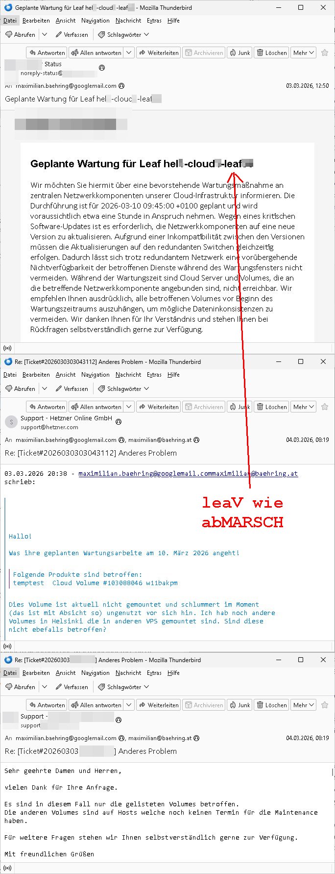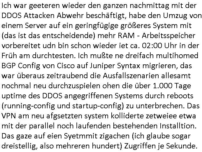 | Erst greifen "Botnetz - Hacker" Server per DDOS-Attacken an unter deren Last jedes Netz zusammenbricht und dann machen sie einem ein Angebot auf ihren "KleyRex" nahen GhostNet/TGC usw. Servercluster umzuziehen (alles rings um den in sogar in TV Beiträgen ins gerede gekommenen Anbieter 4b42) indem sie dafür sorgen daß in Vergleiches Datenbanken (sowas wie "webhostlist") udn zwar genau zu dem zeitpunkt des DDOS-Angriffs wo sich jeder SysOp überlegen würde ob er mehr Kapazität anmietet Super-sonderangebote von ihnen auftauchen. Mietet man dann testweise tatsächlich so ein Server an sostelltsich heraus daß er zu der anbietergruppe gehört deren Personal mit DNS Revers Einträgen auf "color" wie in "BUNT-eswehr" darauf hinweist daß sie Militärs in der Belegschaft haben dazu gab es mal ne Absprach beim Terrorabwehrmeeting Arbeitgeberverband/Gewerkschaften (Hexenkessel 1998). Auch den in letzter zeit wackeligen Server im Osteuropa (aber EU) Ausland habe ich gezwungenermaßen ersetzt. Beim Umzug merket ich daß da noch die Demo-Plattform darauf lief dei ich gebastelt hatte fürs gerichts mit der ich zeigen wollte wie das mit der "Bader Computer BIGfax" Backend Angreifbarkeit im Rechenzterum von ich glaube Atman/OVH in Polen aussah zu den Zeiten des Spreng-stoffnschlags auf Herrhausen und Juwelier Zeus Überfall. Wo die BIGfax nutzen wollten fürs verschwinden lassen/ Abfangen von Tele-Faxen von Ostgebiete / Ostpreussen Alteigentümern die Saltscher Enteigungen rückfoderten.