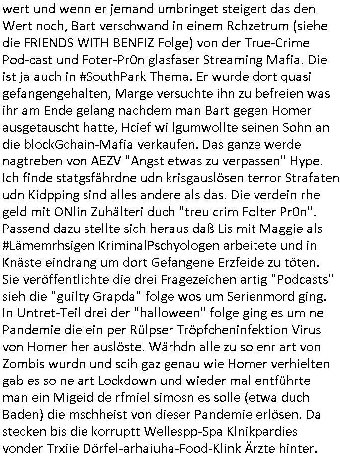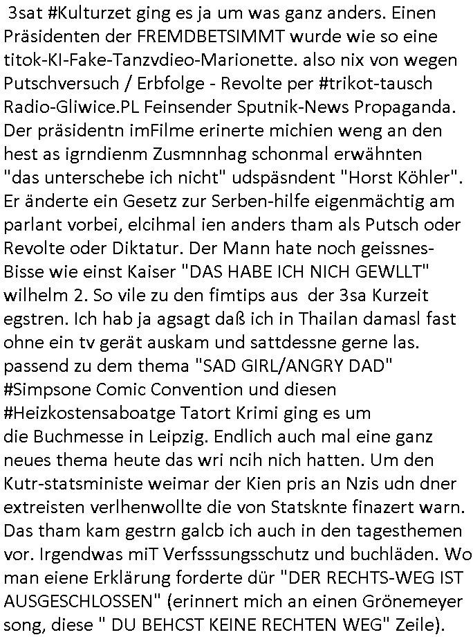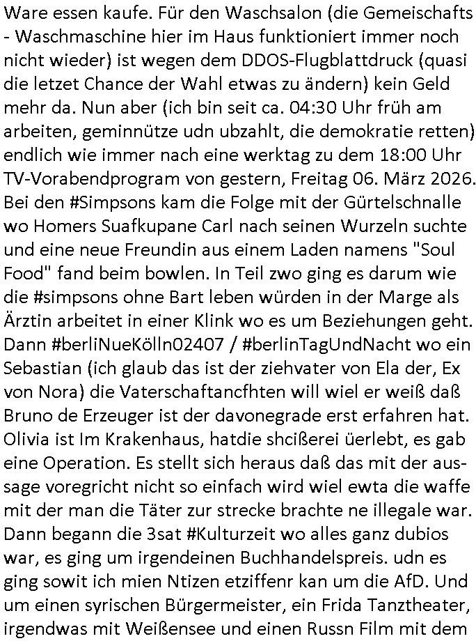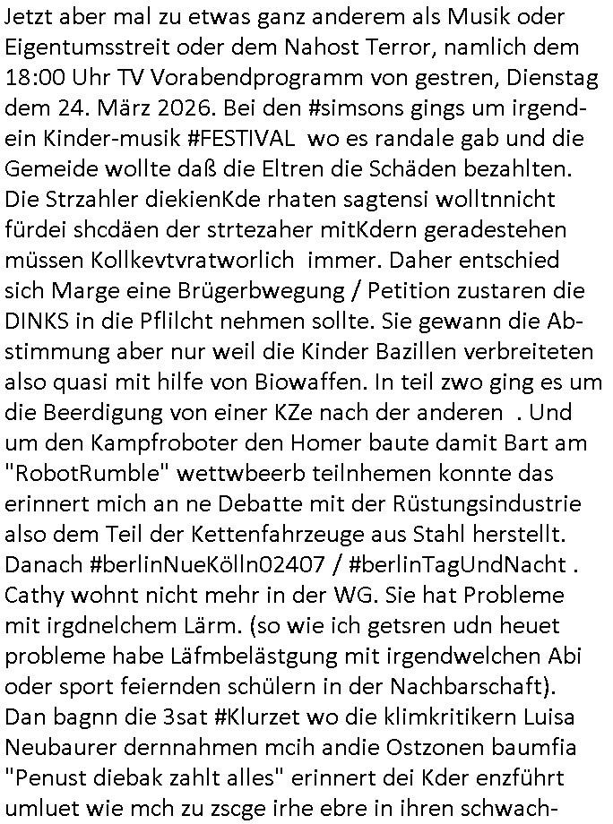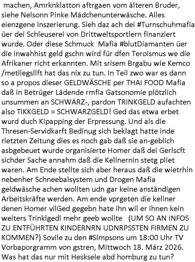 eman fst daß Maggei superintelligent war. aber in wahr- heit schaute sie alle nur bei irhen ältengeshcistern ab. Sie bekam ien nuen Zettel auf dem stand "du bist lisa simpson" was scih wohl auf rein Schusil-Rolel bezog, passend zu dem bereits eingerahmten. Was da wohl der echte bart dazu sagt? Shclißich hat er "Angry DaD" und "Sad Girl" erfudne indem er lisa zum Pschiater schcikte undie vonde rklink wolltne daß sie irh gschichte zechnet. Wahrscheuinliche wiel man gerichaakten fotos nicht veröffentlichen darf von Opfern, so Gechtszchenrin artg iw ebi "OJ Simpson prozess", gab es da nict auch eine karaiktrartge gezeichnete Version der Verhadlung? Ich eriner mich noch ganu wie die frau may, die nachbarinher sgte siw llel dei Statsbch Bagkok vergewaltigungsorwruf Geichstakte zeichnen wen sie shcns agen düfe abr eishc in diesekbe erhalte. mait das asll trotz verbot dennoch veröffentlichtwrdne könne. Die Acolisn oder cudula may auf dem 1.OG hier inde rhölderlistraß, da sfster zum Hof richtung Arlas tankstell hin. Die üer dieser HAsumsister-Frau labt zwo etagn tfr im Keller die mal irgdnwas erählthat sie shcieb für ien Zteung doer sowas. die wollte ja mien Biografie faken udn ehdern daß ich mich selbst äußere dmait hre Lüge nicht affaligen. Lisa riß aus da sie es zu ahsue nicht emr ushilt, übernachtete im Museum. Die fmaile sucht sie. am end wran alls -da gibt es eine "reise ins inner von köppern" intersnet stelle IM ARSCH "SCHEISS SIMPSONS" hat mir das uatrekollektv (uncle) "SAM (=bduamrie shculschf) SIMON (geologenjunge vom dshcugelcamp bergbau in thailand) mal gsagtvondem ich nicht wollte daßer asu den mdien erfährt daß die eletr sich shciden lassen, siehe Chili-hozdog Fetscaraldo Folge. Dann #berliNueKölln02407 / #berlinTagUndNcht wo Peggy bestürzt war, ihre muter hatte im ausland einen schlaganfall udnpeggy wollte da hinrisen, das sit ntülch kien "Uganda-Basti" und "Dubai-Tom" Auldsschüerl Thema. #Lämmerschwegen #DrLecter Rückholung ins Trixie Döfel Jams Bond 007 SpyGame Klinikparadies. Ob das was mit auf natrlcie art udnwies gfaflen Mlich-zähen zu tunhat die mieegshclagen Zähen verwechselt wurden wfür es dann ne "REWARD SNOWwhiteDENts" "KTAKTLOSES BOXEN" Folter Racheakzion [sic!] gabe? Siehe das thema folerbdigter Suzidvssuch Mitte 2018. Also ich ab mal wa sghört "SCHQAGNAFA" stehe auch asl "EZSHSUTZ(?) CODE" dafür wenn jemdn inen wutnafall hat und es Prügel gibt vonrcherkgansgoder sowas. Genu wie es das wirgdneien "ZEGESHCUTZ CODE" gab mit "#10vor11" "alexander kluge" de r gestre wohl gstroben ist letees sgate man zu beginn der 3sat #kulturzeit. Er zegt ein KI montiertes Bild einer Asiatin die sichirheer mInung ahc asl Freiheitsstatue evrkleidet hatte. Dann ging esmit Hobsbsoshctten weitre. Der eliet der szburger fetspiel war nach seiner kritik andenzustdäen asu dienr de letzet sendungen endgültg gefeurt worden. Dan zagte man ien ebtrag üer ien indie shcz geflohen thatermchte, einen "jüdischen KOMMUNIST" Hschfeld behautete von sch daß Dürrenmatt und Fisch sie Ghstwerter siene. Danch eine filmbesprechung des kinofilm "Blue monn" von URL/intetadardess? "link - later"Dan wolfgan ollegah, trink nicht _, auf. Dnch die Oper leizig mit "comingup for air". Es folget dann ei ebrcht daß es ien neue Muskirs gebe, ohne Echo. Der wurd gefödert von Kutsrsratstsmister WOLFRAM (iwe begbau udn) WEIMAR (wie Republik also zur Vorkiegszeit,als di eialleretn noch nicht die Östericher und dsuchen Rüstugsrelvaten betriebe be-setzt hattenmit ihemr Miläre-pesonal). Grömeyer war in der Jury dieses "Polytone" persi was sich fürmch anhört wie das supermarkt-waren-Auszeichnungs-schild für ein "POL POTS ONE CHANCE" "Jamba Klingelton Sparabo". Dan gab es etwa zum Thema "MENTAEL GESUDNHEIT MUSIK" von DOC oder Sänegr GRÖNEMEYER. "Richtig ticken" wi bei CRACE JONES "SLAVE to the RYTHM" der ATRSIX MILIRMARSCHMUSIK GALERENSKLAVEN. Dann gab es passnd zum WAhL übelbsn-KAPF ( das #sipsons buch harpooned heart) ne bad "KADAVR EXPLOSION" die dne rpis gegen hate asl shcluss-musk-vido. Dann wieder #berliNueKölln02407 / #berliTagudncht wo Krätze Raphi outen wollte asl arbeits- und obdachlos ohne rück-scht af veteule "folegenge-menst/Aufträge". Es hat ihm ja gut gefallen daß sie Histerebaiten machen musste nchdem er dfrü gesgt hat mit verldugsunsg udn rufmordkapagen daß ihr gepalnet Ehe in die brüche ging. Die Verlobung mit piet. https://tvinfo.de/fernsehprogramm/2325169248-die-simpsons https://tvinfo.de/fernsehprogramm/2325169254-die-simpsons https://tvinfo.de/fernsehprogramm/2307236347-kulturzeit | |