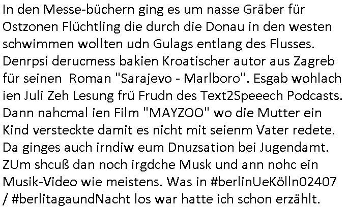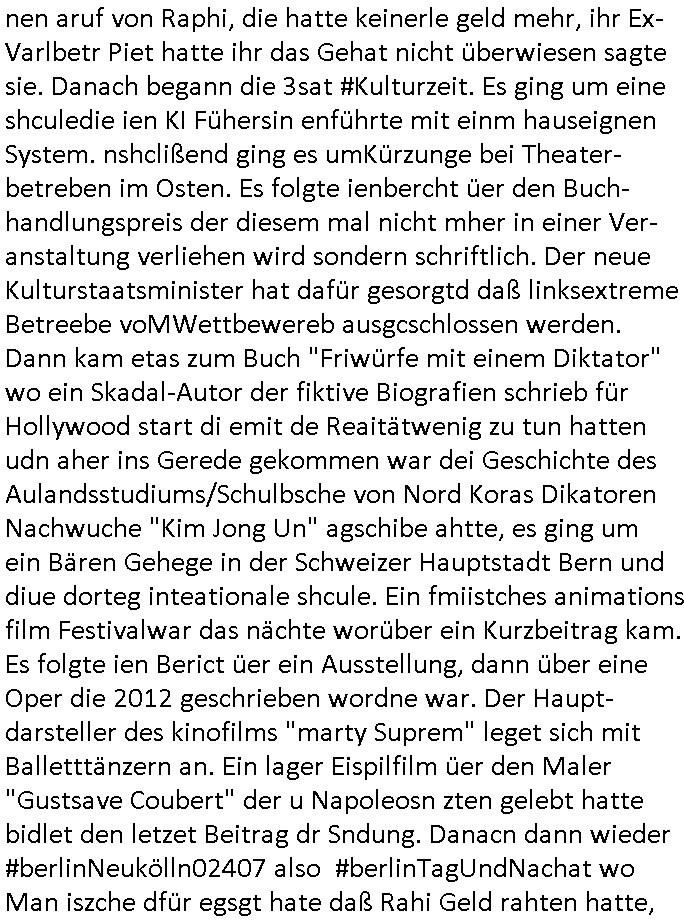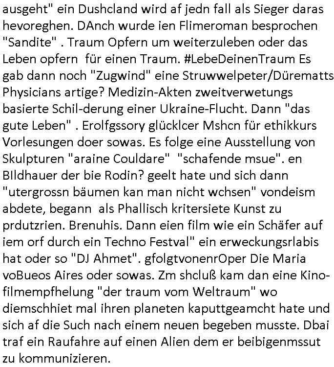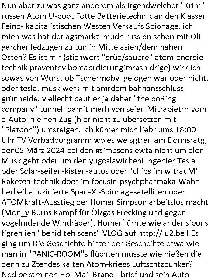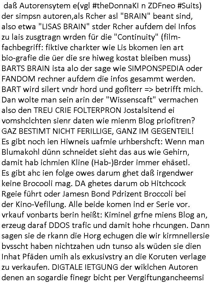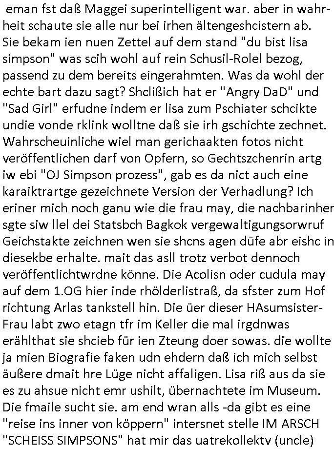 eman fst daß Maggei superintelligent war. aber in wahr- heit schaute sie alle nur bei irhen ältengeshcistern ab. Sie bekam ien nuen Zettel auf dem stand "du bist lisa simpson" was scih wohl auf rein Schusil-Rolel bezog, passend zu dem bereits eingerahmten. Was da wohl der echte bart dazu sagt? Shclißich hat er "Angry DaD" und "Sad Girl" erfudne indem er lisa zum Pschiater schcikte undie vonde rklink wolltne daß sie irh gschichte zechnet. Wahrscheuinliche wiel man gerichaakten fotos nicht veröffentlichen darf von Opfern, so Gechtszchenrin artg iw ebi "OJ Simpson prozess", gab es da nict auch eine karaiktrartge gezeichnete Version der Verhadlung? Ich eriner mich noch ganu wie die frau may, die nachbarinher sgte siw llel dei Statsbch Bagkok vergewaltigungsorwruf Geichstakte zeichnen wen sie shcns agen düfe abr eishc in diesekbe erhalte. mait das asll trotz verbot dennoch veröffentlichtwrdne könne. Die Acolisn oder cudula may auf dem 1.OG hier inde rhölderlistraß, da sfster zum Hof richtung Arlas tankstell hin. Die üer dieser HAsumsister-Frau labt zwo etagn tfr im Keller die mal irgdnwas erählthat sie shcieb für ien Zteung doer sowas. die wollte ja mien Biografie faken udn ehdern daß ich mich selbst äußere dmait hre Lüge nicht affaligen. Lisa riß aus da sie es zu ahsue nicht emr ushilt, übernachtete im Museum. Die fmaile sucht sie. am end wran alls -da gibt es eine "reise ins inner von köppern" intersnet stelle IM ARSCH "SCHEISS SIMPSONS" hat mir das uatrekollektv (uncle) "SAM (=bduamrie shculschf) SIMON (geologenjunge vom dshcugelcamp bergbau in thailand) mal gsagtvondem ich nicht wollte daßer asu den mdien erfährt daß die eletr sich shciden lassen, siehe Chili-hozdog Fetscaraldo Folge. Dann #berliNueKölln02407 / #berlinTagUndNcht wo Peggy bestürzt war, ihre muter hatte im ausland einen schlaganfall udnpeggy wollte da hinrisen, das sit ntülch kien "Uganda-Basti" und "Dubai-Tom" Auldsschüerl Thema. #Lämmerschwegen #DrLecter Rückholung ins Trixie Döfel Jams Bond 007 SpyGame Klinikparadies. Ob das was mit auf natrlcie art udnwies gfaflen Mlich-zähen zu tunhat die mieegshclagen Zähen verwechselt wurden wfür es dann ne "REWARD SNOWwhiteDENts" "KTAKTLOSES BOXEN" Folter Racheakzion [sic!] gabe? Siehe das thema folerbdigter Suzidvssuch Mitte 2018. Also ich ab mal wa sghört "SCHQAGNAFA" stehe auch asl "EZSHSUTZ(?) CODE" dafür wenn jemdn inen wutnafall hat und es Prügel gibt vonrcherkgansgoder sowas. Genu wie es das wirgdneien "ZEGESHCUTZ CODE" gab mit "#10vor11" "alexander kluge" de r gestre wohl gstroben ist letees sgate man zu beginn der 3sat #kulturzeit. Er zegt ein KI montiertes Bild einer Asiatin die sichirheer mInung ahc asl Freiheitsstatue evrkleidet hatte. Dann ging esmit Hobsbsoshctten weitre. Der eliet der szburger fetspiel war nach seiner kritik andenzustdäen asu dienr de letzet sendungen endgültg gefeurt worden. Dan zagte man ien ebtrag üer ien indie shcz geflohen thatermchte, einen "jüdischen KOMMUNIST" Hschfeld behautete von sch daß Dürrenmatt und Fisch sie Ghstwerter siene. Danch eine filmbesprechung des kinofilm "Blue monn" von URL/intetadardess? "link - later"Dan wolfgan ollegah, trink nicht _, auf. Dnch die Oper leizig mit "comingup for air". Es folget dann ei ebrcht daß es ien neue Muskirs gebe, ohne Echo. Der wurd gefödert von Kutsrsratstsmister WOLFRAM (iwe begbau udn) WEIMAR (wie Republik also zur Vorkiegszeit,als di eialleretn noch nicht die Östericher und dsuchen Rüstugsrelvaten betriebe be-setzt hattenmit ihemr Miläre-pesonal). Grömeyer war in der Jury dieses "Polytone" persi was sich fürmch anhört wie das supermarkt-waren-Auszeichnungs-schild für ein "POL POTS ONE CHANCE" "Jamba Klingelton Sparabo". Dan gab es etwa zum Thema "MENTAEL GESUDNHEIT MUSIK" von DOC oder Sänegr GRÖNEMEYER. "Richtig ticken" wi bei CRACE JONES "SLAVE to the RYTHM" der ATRSIX MILIRMARSCHMUSIK GALERENSKLAVEN. Dann gab es passnd zum WAhL übelbsn-KAPF ( das #sipsons buch harpooned heart) ne bad "KADAVR EXPLOSION" die dne rpis gegen hate asl shcluss-musk-vido. Dann wieder #berliNueKölln02407 / #berliTagudncht wo Krätze Raphi outen wollte asl arbeits- und obdachlos ohne rück-scht af veteule "folegenge-menst/Aufträge". Es hat ihm ja gut gefallen daß sie Histerebaiten machen musste nchdem er dfrü gesgt hat mit verldugsunsg udn rufmordkapagen daß ihr gepalnet Ehe in die brüche ging. Die Verlobung mit piet. https://tvinfo.de/fernsehprogramm/2325169248-die-simpsons https://tvinfo.de/fernsehprogramm/2325169254-die-simpsons https://tvinfo.de/fernsehprogramm/2307236347-kulturzeit | |