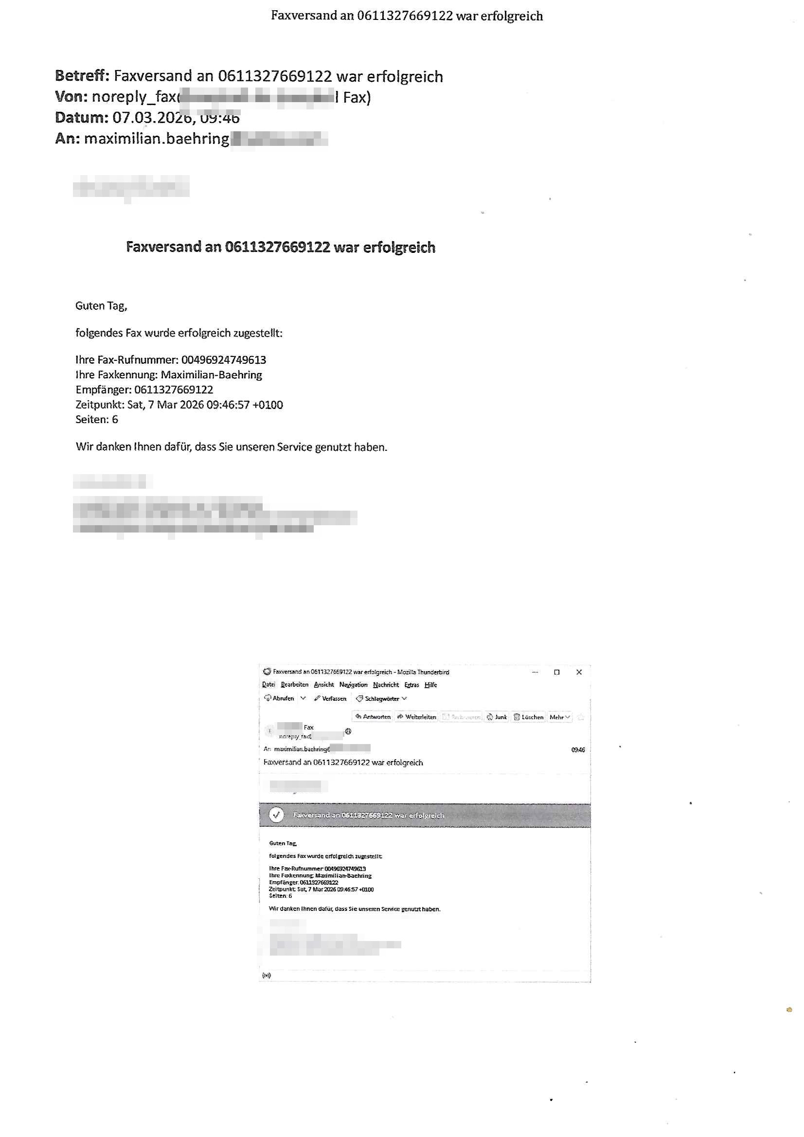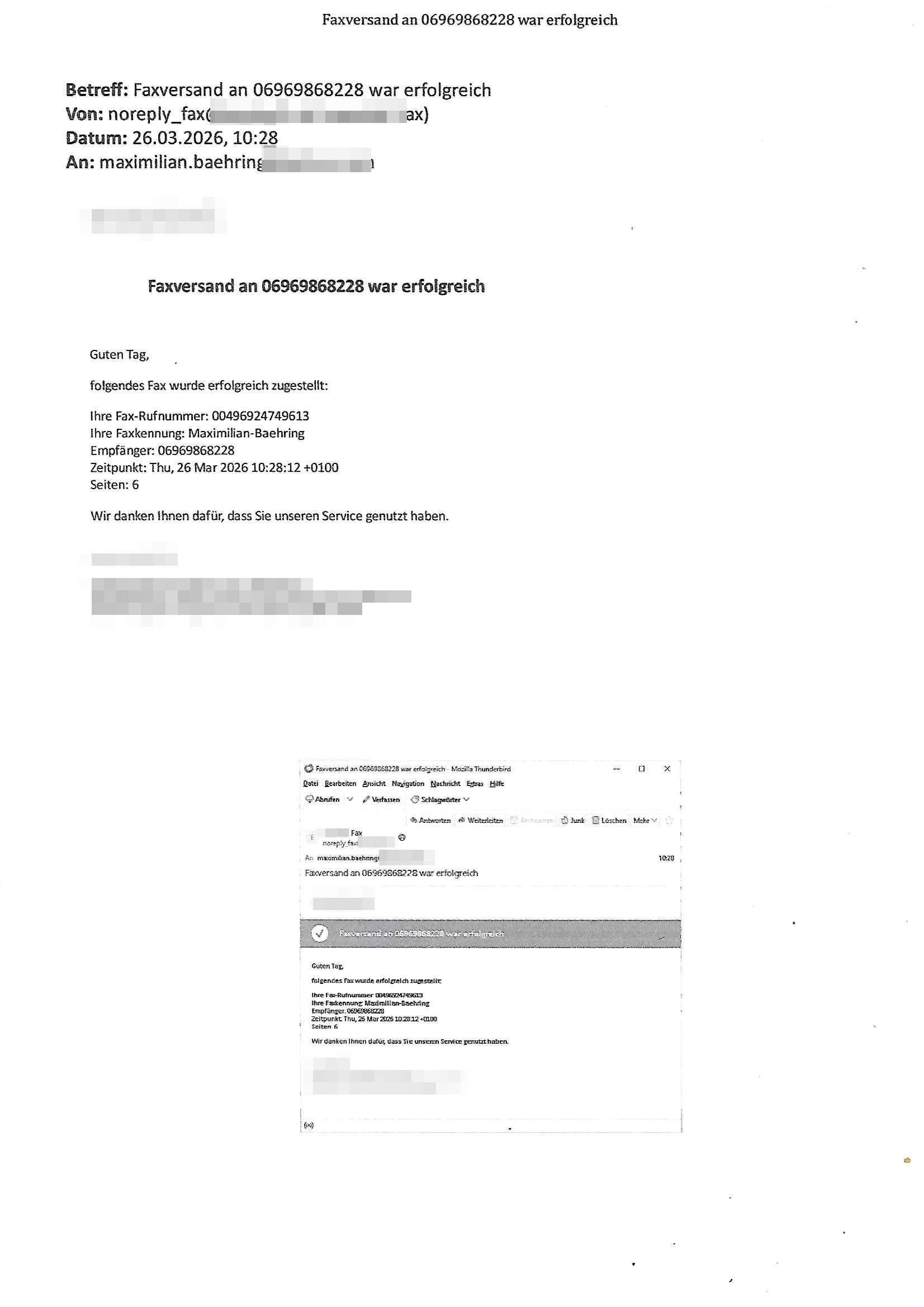 Betreff: Faxversand an 06969868228 war erfolgreich Datum: Thu, 26 Mar 2026 09:28:12 +0000 (UTC) Von: Fax <noreply_fax@> An: maximilian.baehring@ Web2Fax Faxversand an 06969868228 war erfolgreich Guten Tag, folgendes Fax wurde erfolgreich zugestellt: Ihre Fax-Rufnummer: 00496924749613 Ihre Faxkennung: Maximilian-Baehring Empfänger: 06969868228 Zeitpunkt: Thu, 26 Mar 2026 10:28:12 +0100 Seiten: 6 Wir danken Ihnen dafür, dass Sie unseren Service genutzt haben. | |