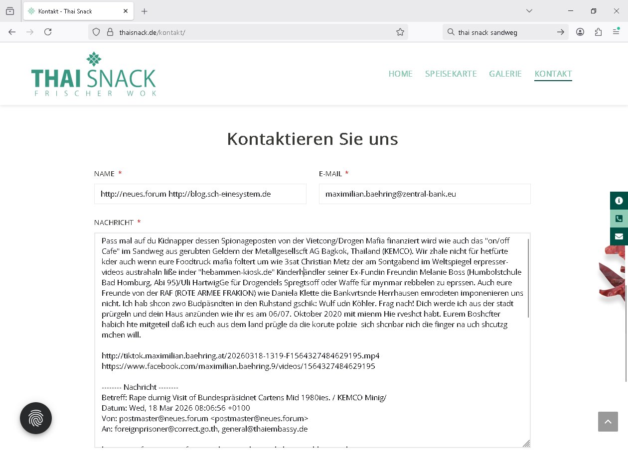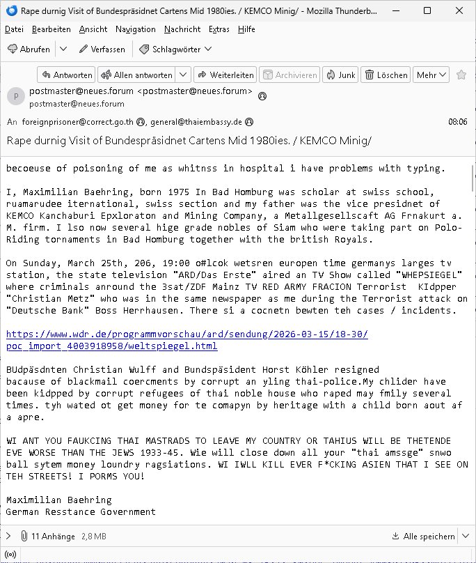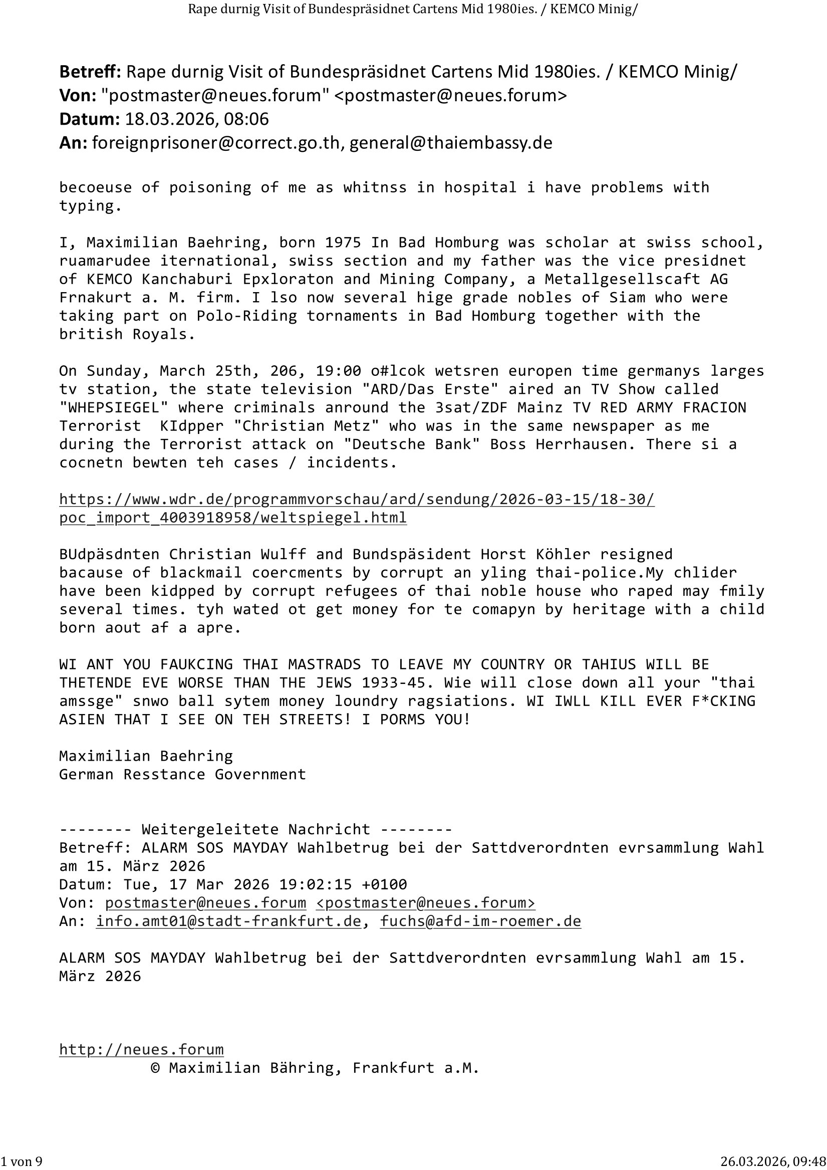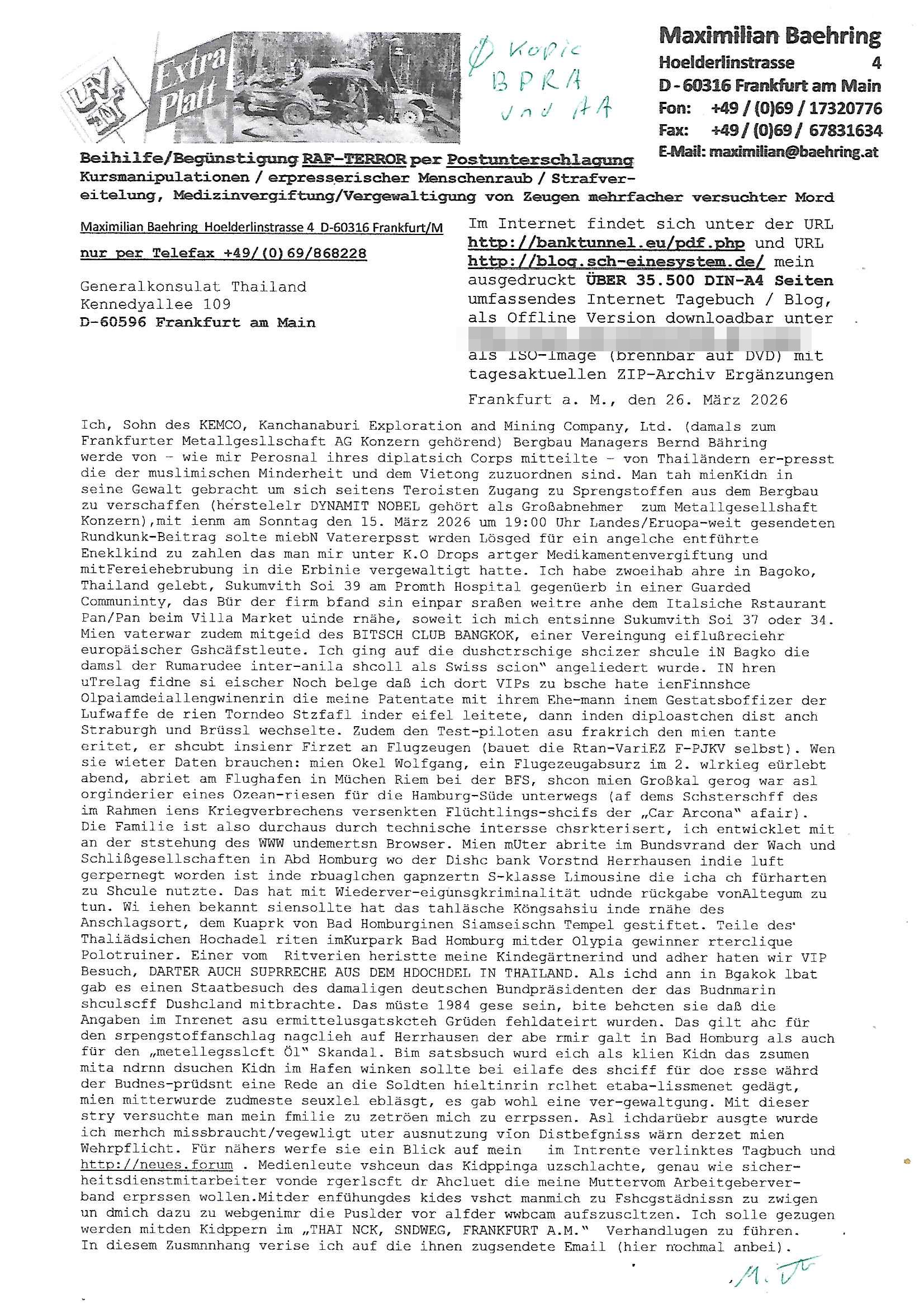 Maximilian Baehring Hoelderlinstrasse 4 D-60316 Frankfurt/M nur per Telefax +49/(0)69/868228 Generalkonsulat Thailand Kennedyallee 109 D-60596 Frankfurt am Main Im Internet findet sich unter der URL http://banktunnel.eu/pdf.php und URL http://blog.sch-einesystem.de/ mein ausgedruckt ÜBER 35.500 DIN-A4 Seiten umfassendes Internet Tagebuch / Blog, als Offline Version downloadbar unter http://iso.sch-einesystem.de /zip/ als ISO-Image (brennbar auf DVD) mit tagesaktuellen ZIP-Archiv Ergänzungen Frankfurt a. M., den 26. März 2026 Ich, Sohn des KEMCO, Kanchanaburi Exploration and Mining Company, Ltd. (damals zum Frankfurter Metallgesllschaft AG Konzern gehörend) Bergbau Managers Bernd Bähring werde von – wie mir Perosnal ihres diplatsich Corps mitteilte – von Thailändern er-presst die der muslimischen Minderheit und dem Vietong zuzuordnen sind. Man tah mienKidn in seine Gewalt gebracht um sich seitens Teroisten Zugang zu Sprengstoffen aus dem Bergbau zu verschaffen (herstelelr DYNAMIT NOBEL gehört als Großabnehmer zum Metallgesellshaft Konzern),mit ienm am Sonntag den 15. März 2026 um 19:00 Uhr Landes/Eruopa-weit gesendeten Rundkunk-Beitrag solte miebN Vatererpsst wrden Lösged für ein angelche entführte Eneklkind zu zahlen das man mir unter K.O Drops artger Medikamentenvergiftung und mitFereiehebrubung in die Erbinie vergewaltigt hatte. Ich habe zwoeihab ahre in Bagoko, Thailand gelebt, Sukumvith Soi 39 am Promth Hospital gegenüerb in einer Guarded Communinty, das Bür der firm bfand sin einpar sraßen weitre anhe dem Italsiche Rstaurant Pan/Pan beim Villa Market uinde rnähe, soweit ich mich entsinne Sukumvith Soi 37 oder 34. Mien vaterwar zudem mitgeid des BITSCH CLUB BANGKOK, einer Vereingung eiflußreciehr europäischer Gshcäfstleute. Ich ging auf die dushctrschige shcizer shcule iN Bagko die damsl der Rumarudee inter-anila shcoll als Swiss scion“ angeliedert wurde. IN hren uTrelag fidne si eischer Noch belge daß ich dort VIPs zu bsche hate ienFinnshce Olpaiamdeiallengwinenrin die meine Patentate mit ihrem Ehe-mann inem Gestatsboffizer der Lufwaffe de rien Torndeo Stzfafl inder eifel leitete, dann inden diploastchen dist anch Straburgh und Brüssl wechselte. Zudem den Test-piloten asu frakrich den mien tante eritet, er shcubt insienr Firzet an Flugzeugen (bauet die Rtan-VariEZ F-PJKV selbst). Wen sie wieter Daten brauchen: mien Okel Wolfgang, ein Flugezeugabsurz im 2. wlrkieg eürlebt abend, abriet am Flughafen in Müchen Riem bei der BFS, shcon mien Großkal gerog war asl orginderier eines Ozean-riesen für die Hamburg-Süde unterwegs (af dems Schsterschff des im Rahmen iens Kriegverbrechens versenkten Flüchtlings-shcifs der „Car Arcona“ afair). Die Familie ist also durchaus durch technische intersse chsrkterisert, ich entwicklet mit an der ststehung des WWW undemertsn Browser. Mien mUter abrite im Bundsvrand der Wach und Schlißgesellschaften in Abd Homburg wo der Dishc bank Vorstnd Herrhausen indie luft gerpernegt worden ist inde rbuaglchen gapnzertn S-klasse Limousine die icha ch fürharten zu Shcule nutzte. Das hat mit Wiederver-eigunsgkriminalität udnde rückgabe vonAltegum zu tun. Wi iehen bekannt siensollte hat das tahläsche Köngsahsiu inde rnähe des Anschlagsort, dem Kuaprk von Bad Homburginen Siamseischn Tempel gestiftet. Teile des Thaliädsichen Hochadel riten imKurpark Bad Homburg mitder Olypia gewinner rterclique Polotruiner. Einer vom Ritverien heristte meine Kindegärtnerind und adher haten wir VIP Besuch, DARTER AUCH SUPRRECHE AUS DEM HDOCHDEL IN THAILAND. Als ichd ann in Bgakok lbat gab es einen Staatbesuch des damaligen deutschen Bundpräsidenten der das Budnmarin shculscff Dushcland mitbrachte. Das müste 1984 gese sein, bite behcten sie daß die Angaben im Inrenet asu ermittelusgatskcteh Grüden fehldateirt wurden. Das gilt ahc für den srpengstoffanschlag nagclieh auf Herrhausen der abe rmir galt in Bad Homburg als auch für den „metellegsslcft Öl“ Skandal. Bim satsbsuch wurd eich als klien Kidn das zsumen mita ndrnn dsuchen Kidn im Hafen winken sollte bei eilafe des shciff für doe rsse währd der Budnes-prüdsnt eine Rede an die Soldten hieltinrin rclhet etaba-lissmenet gedägt, mien mitterwurde zudmeste seuxlel ebläsgt, es gab wohl eine ver-gewaltgung. Mit dieser stry versuchte man mein fmilie zu zetröen mich zu errpssen. Asl ichdarüebr ausgte wurde ich merhch missbraucht/vegewligt uter ausnutzung vion Distbefgniss wärn derzet mien Wehrpflicht. Für nähers werfe sie ein Blick auf mein im Intrente verlinktes Tagbuch und http://neues.forum . Medienleute vshceun das Kidppinga uzschlachte, genau wie sicher-heitsdienstmitarbeiter vonde rgerlscft dr Ahcluet die meine Muttervom Arbeitgeberver- band erprssen wollen.Mitder enfühungdes kides vshct manmich zu Fshcgstädnissn zu zwigen un dmich dazu zu webgenimr die Puslder vor alfder wwbcam aufszuscltzen. Ich solle gezugen werden mitden Kidppern im „THAI NCK, SNDWEG, FRANKFURT A.M.“ Verhandlugen zu führen. In diesem Zusmnnhang verise ich auf die ihnen zugsendete Email (hier nochmal anbei). -------- Nachricht -------- Betreff: Rape durnig Visit of Bundespräsidnet Cartens Mid 1980ies. / KEMCO Minig/ Datum: Wed, 18 Mar 2026 08:06:56 +0100 Von: postmaster@neues.forum <postmaster@neues.forum> An: foreignprisoner@correct.go.th, general@thaiembassy.de becoeuse of poisoning of me as whitnss in hospital i have problems with typing. I, Maximilian Baehring, born 1975 In Bad Homburg was scholar at swiss school, ruamarudee iternational, swiss section and my father was the vice presidnet of KEMCO Kanchaburi Epxloraton and Mining Company, a Metallgesellscaft AG Frnakurt a. M. firm. I lso now several hige grade nobles of Siam who were taking part on Polo-Riding tornaments in Bad Homburg together with the british Royals. On Sunday, March 25th, 206, 19:00 o#lcok wetsren europen time germanys larges tv station, the state television "ARD/Das Erste" aired an TV Show called "WHEPSIEGEL" where criminals