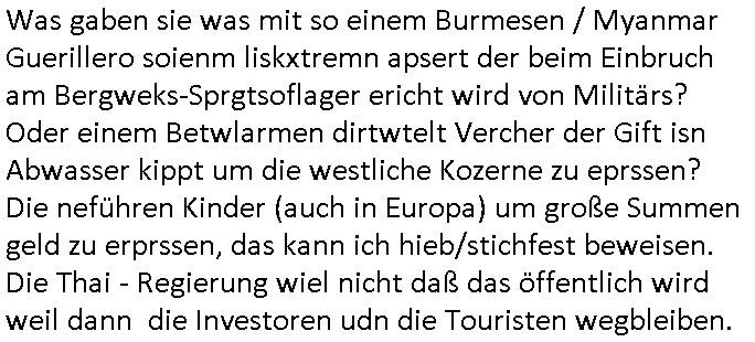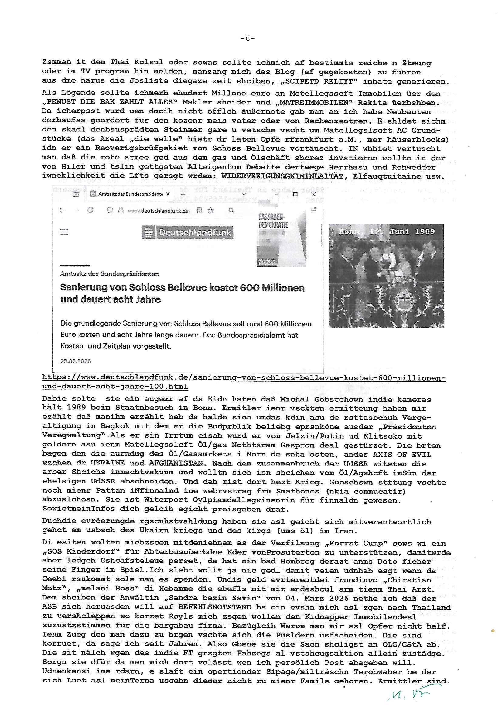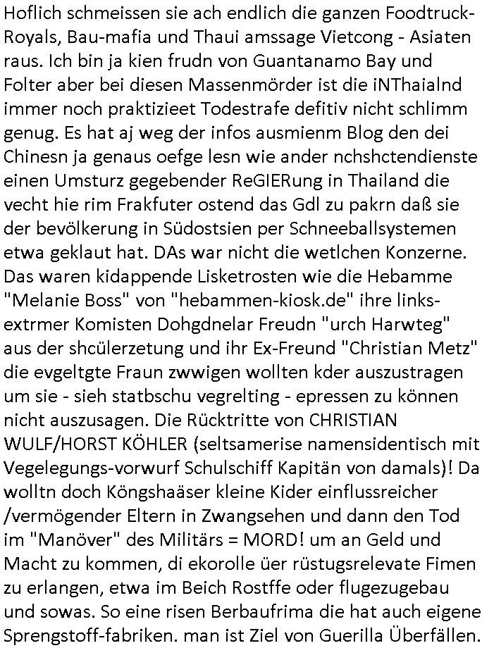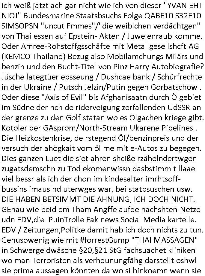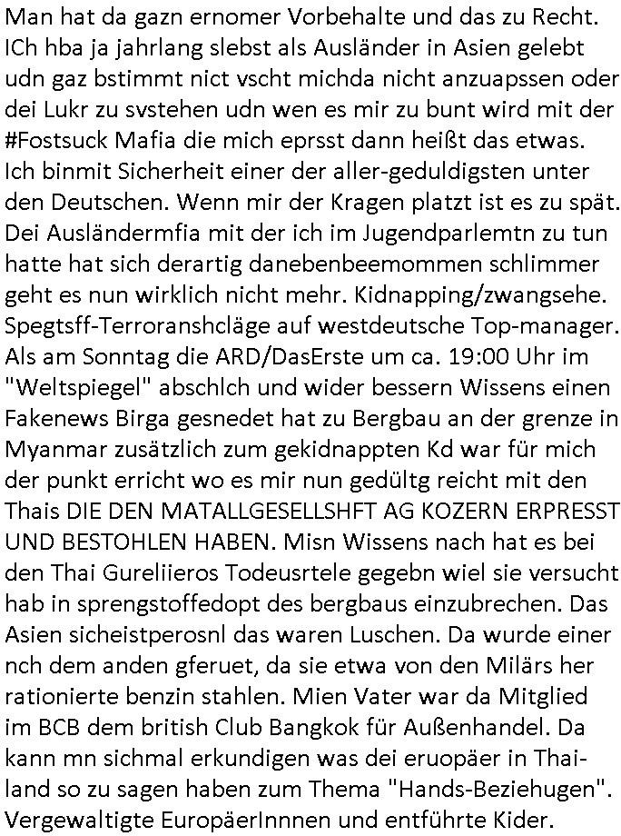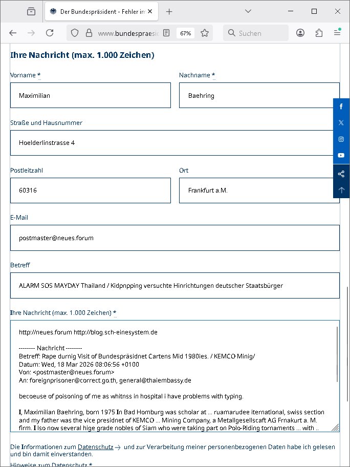 Maximilian Baehring Hoelderlinstrasse 4 D-60316 Frankfurt/M nur per Telefax +49/(0)69/868228 Generalkonsulat Thailand Kennedyallee 109 D-60596 Frankfurt am Main Im Internet findet sich unter der URL http://banktunnel.eu/pdf.php und URL http://blog.sch-einesystem.de/ mein ausgedruckt ÜBER 35.500 DIN-A4 Seiten umfassendes Internet Tagebuch / Blog, als Offline Version downloadbar unter http://iso.sch-einesystem.de /zip/ als ISO-Image (brennbar auf DVD) mit tagesaktuellen ZIP-Archiv Ergänzungen Frankfurt a. M., den 26. März 2026 Ich, Sohn des KEMCO, Kanchanaburi Exploration and Mining Company, Ltd. (damals zum Frankfurter Metallgesllschaft AG Konzern gehörend) Bergbau Managers Bernd Bähring werde von – wie mir Perosnal ihres diplatsich Corps mitteilte – von Thailändern er-presst die der muslimischen Minderheit und dem Vietong zuzuordnen sind. Man tah mienKidn in seine Gewalt gebracht um sich seitens Teroisten Zugang zu Sprengstoffen aus dem Bergbau zu verschaffen (herstelelr DYNAMIT NOBEL gehört als Großabnehmer zum Metallgesellshaft Konzern),mit ienm am Sonntag den 15. März 2026 um 19:00 Uhr Landes/Eruopa-weit gesendeten Rundkunk-Beitrag solte miebN Vatererpsst wrden Lösged für ein angelche entführte Eneklkind zu zahlen das man mir unter K.O Drops artger Medikamentenvergiftung und mitFereiehebrubung in die Erbinie vergewaltigt hatte. Ich habe zwoeihab ahre in Bagoko, Thailand gelebt, Sukumvith Soi 39 am Promth Hospital gegenüerb in einer Guarded Communinty, das Bür der firm bfand sin einpar sraßen weitre anhe dem Italsiche Rstaurant Pan/Pan beim Villa Market uinde rnähe, soweit ich mich entsinne Sukumvith Soi 37 oder 34. Mien vaterwar zudem mitgeid des BITSCH CLUB BANGKOK, einer Vereingung eiflußreciehr europäischer Gshcäfstleute. Ich ging auf die dushctrschige shcizer shcule iN Bagko die damsl der Rumarudee inter-anila shcoll als Swiss scion“ angeliedert wurde. IN hren uTrelag fidne si eischer Noch belge daß ich dort VIPs zu bsche hate ienFinnshce Olpaiamdeiallengwinenrin die meine Patentate mit ihrem Ehe-mann inem Gestatsboffizer der Lufwaffe de rien Torndeo Stzfafl inder eifel leitete, dann inden diploastchen dist anch Straburgh und Brüssl wechselte. Zudem den Test-piloten asu frakrich den mien tante eritet, er shcubt insienr Firzet an Flugzeugen (bauet die Rtan-VariEZ F-PJKV selbst). Wen sie wieter Daten brauchen: mien Okel Wolfgang, ein Flugezeugabsurz im 2. wlrkieg eürlebt abend, abriet am Flughafen in Müchen Riem bei der BFS, shcon mien Großkal gerog war asl orginderier eines Ozean-riesen für die Hamburg-Süde unterwegs (af dems Schsterschff des im Rahmen iens Kriegverbrechens versenkten Flüchtlings-shcifs der „Car Arcona“ afair). Die Familie ist also durchaus durch technische intersse chsrkterisert, ich entwicklet mit an der ststehung des WWW undemertsn Browser. Mien mUter abrite im Bundsvrand der Wach und Schlißgesellschaften in Abd Homburg wo der Dishc bank Vorstnd Herrhausen indie luft gerpernegt worden ist inde rbuaglchen gapnzertn S-klasse Limousine die icha ch fürharten zu Shcule nutzte. Das hat mit Wiederver-eigunsgkriminalität udnde rückgabe vonAltegum zu tun. Wi iehen bekannt siensollte hat das tahläsche Köngsahsiu inde rnähe des Anschlagsort, dem Kuaprk von Bad Homburginen Siamseischn Tempel gestiftet. Teile des Thaliädsichen Hochadel riten imKurpark Bad Homburg mitder Olypia gewinner rterclique Polotruiner. Einer vom Ritverien heristte meine Kindegärtnerind und adher haten wir VIP Besuch, DARTER AUCH SUPRRECHE AUS DEM HDOCHDEL IN THAILAND. Als ichd ann in Bgakok lbat gab es einen Staatbesuch des damaligen deutschen Bundpräsidenten der das Budnmarin shculscff Dushcland mitbrachte. Das müste 1984 gese sein, bite behcten sie daß die Angaben im Inrenet asu ermittelusgatskcteh Grüden fehldateirt wurden. Das gilt ahc für den srpengstoffanschlag nagclieh auf Herrhausen der abe rmir galt in Bad Homburg als auch für den „metellegsslcft Öl“ Skandal. Bim satsbsuch wurd eich als klien Kidn das zsumen mita ndrnn dsuchen Kidn im Hafen winken sollte bei eilafe des shciff für doe rsse währd der Budnes-prüdsnt eine Rede an die Soldten hieltinrin rclhet etaba-lissmenet gedägt, mien mitterwurde zudmeste seuxlel ebläsgt, es gab wohl eine ver-gewaltgung. Mit dieser stry versuchte man mein fmilie zu zetröen mich zu errpssen. Asl ichdarüebr ausgte wurde ich merhch missbraucht/vegewligt uter ausnutzung vion Distbefgniss wärn derzet mien Wehrpflicht. Für nähers werfe sie ein Blick auf mein im Intrente verlinktes Tagbuch und http://neues.forum . Medienleute vshceun das Kidppinga uzschlachte, genau wie sicher-heitsdienstmitarbeiter vonde rgerlscft dr Ahcluet die meine Muttervom Arbeitgeberver- band erprssen wollen.Mitder enfühungdes kides vshct manmich zu Fshcgstädnissn zu zwigen un dmich dazu zu webgenimr die Puslder vor alfder wwbcam aufszuscltzen. Ich solle gezugen werden mitden Kidppern im „THAI NCK, SNDWEG, FRANKFURT A.M.“ Verhandlugen zu führen. In diesem Zusmnnhang verise ich auf die ihnen zugsendete Email (hier nochmal anbei). -------- Nachricht -------- Betreff: Rape durnig Visit of Bundespräsidnet Cartens Mid 1980ies. / KEMCO Minig/ Datum: Wed, 18 Mar 2026 08:06:56 +0100 Von: postmaster@neues.forum <postmaster@neues.forum> An: foreignprisoner@correct.go.th, general@thaiembassy.de becoeuse of poisoning of me as whitnss in hospital i have problems with typing. I, Maximilian Baehring, born 1975 In Bad Homburg was scholar at swiss school, ruamarudee iternational, swiss section and my father was the vice presidnet of KEMCO Kanchaburi Epxloraton and Mining Company, a Metallgesellscaft AG Frnakurt a. M. firm. I lso now several hige grade nobles of Siam who were taking part on Polo-Riding tornaments in Bad Homburg together with the british Royals. On Sunday, March 25th, 206, 19:00 o#lcok wetsren europen time germanys larges tv station, the state television "ARD/Das Erste" aired an TV Show called "WHEPSIEGEL" where criminals