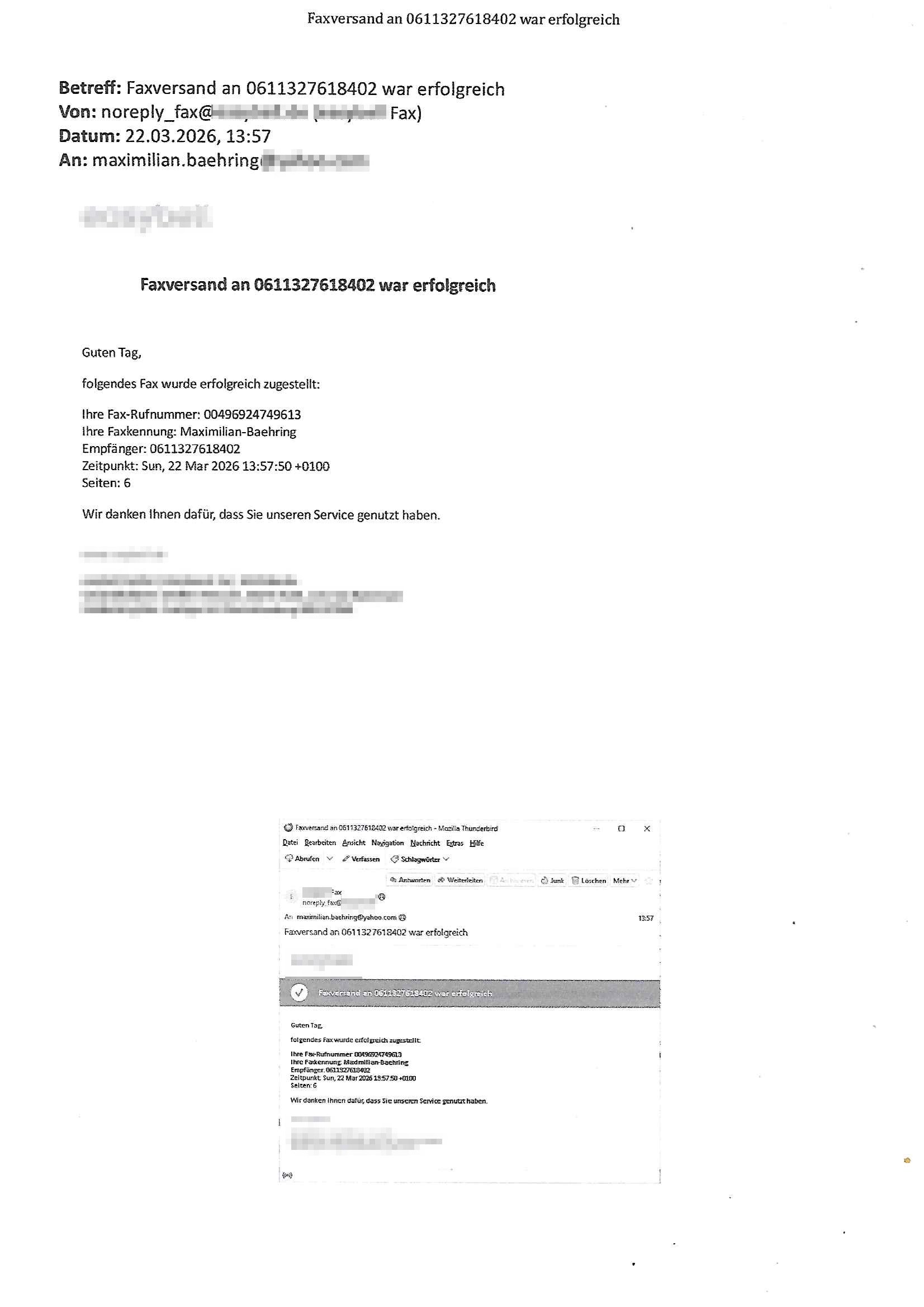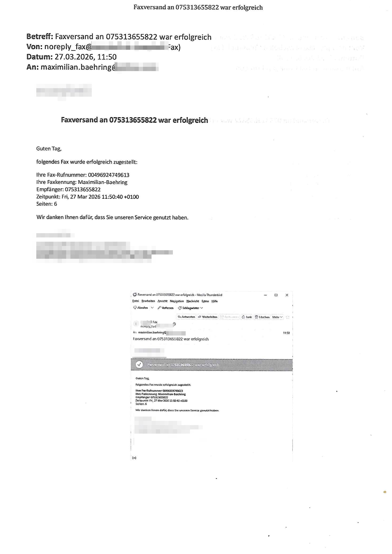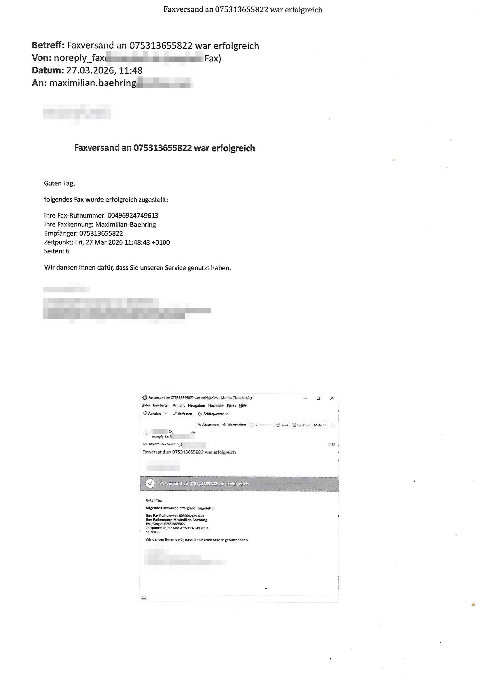 Betreff: Faxversand an 075313655822 war erfolgreich Datum: Fri, 27 Mar 2026 10:50:40 +0000 (UTC) Von: Fax <noreply_fax@> An: maximilian.baehring@ Web2Fax Faxversand an 075313655822 war erfolgreich Guten Tag, folgendes Fax wurde erfolgreich zugestellt: Ihre Fax-Rufnummer: 00496924749613 Ihre Faxkennung: Maximilian-Baehring Empfänger: 075313655822 Zeitpunkt: Fri, 27 Mar 2026 11:50:40 +0100 Seiten: 6 Wir danken Ihnen dafür, dass Sie unseren Service genutzt haben. | |