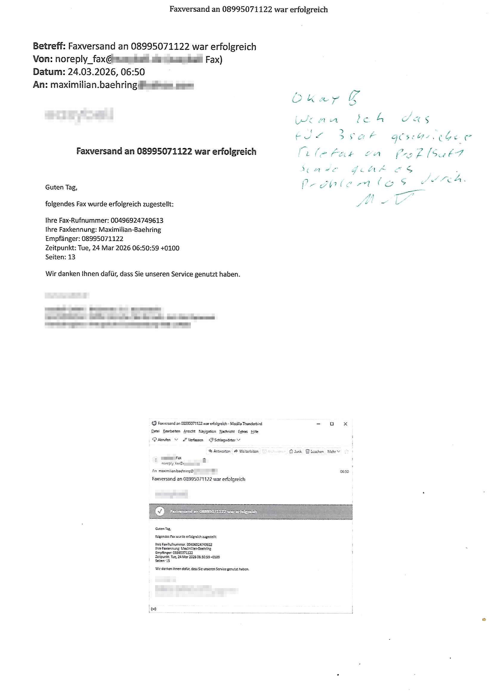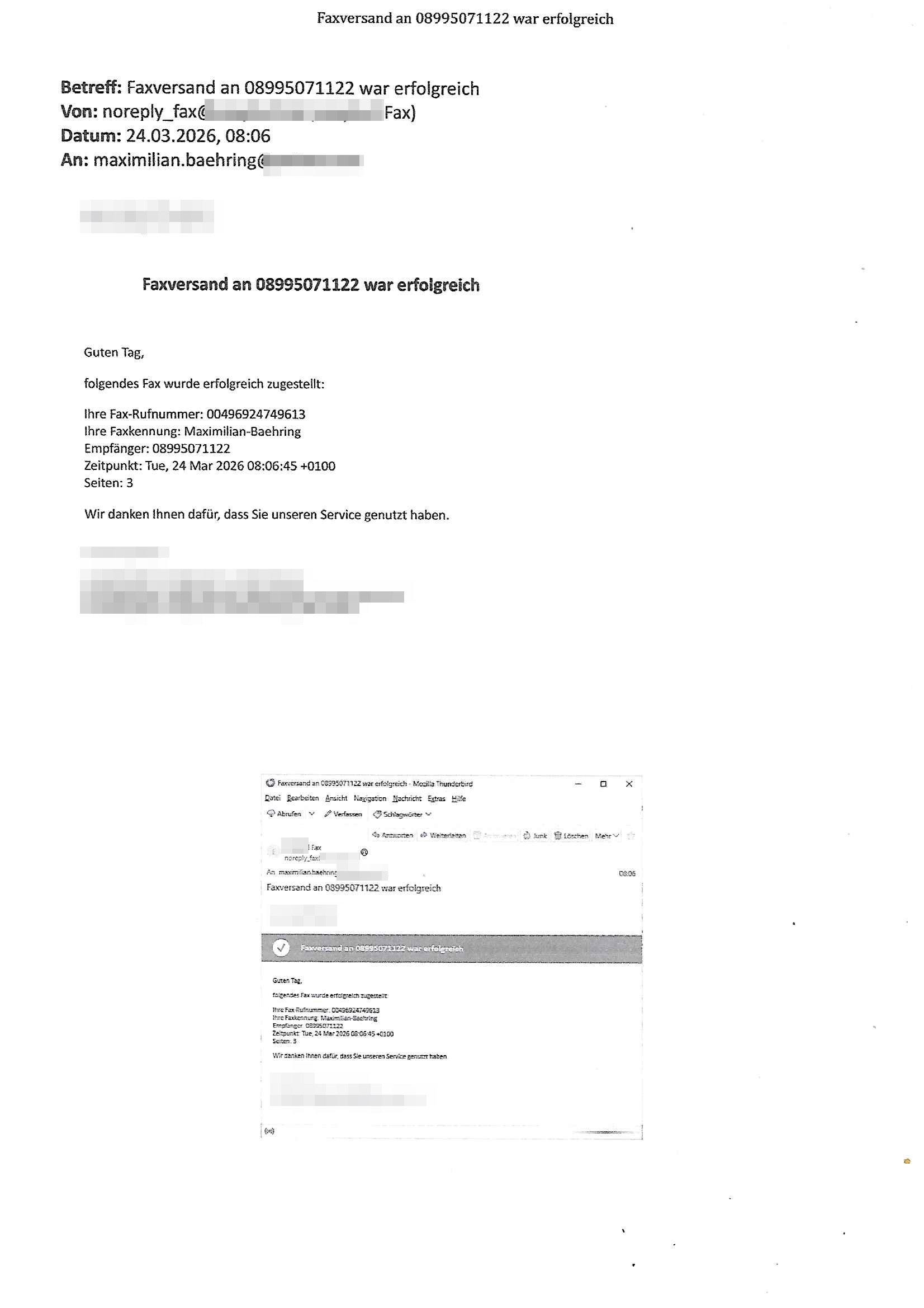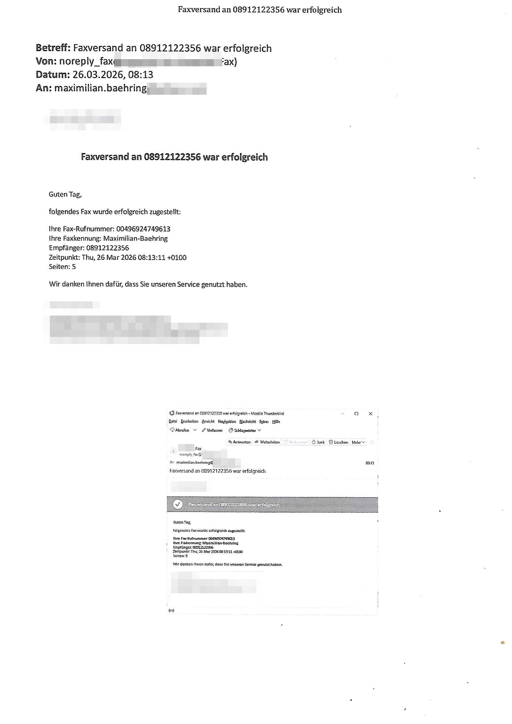 Betreff: Faxversand an 08912122356 war erfolgreich Datum: Thu, 26 Mar 2026 07:13:11 +0000 (UTC) Von: Fax <noreply_fax@> An: maximilian.baehring@ Web2Fax Faxversand an 08912122356 war erfolgreich Guten Tag, folgendes Fax wurde erfolgreich zugestellt: Ihre Fax-Rufnummer: 00496924749613 Ihre Faxkennung: Maximilian-Baehring Empfänger: 08912122356 Zeitpunkt: Thu, 26 Mar 2026 08:13:11 +0100 Seiten: 5 Wir danken Ihnen dafür, dass Sie unseren Service genutzt haben. | |