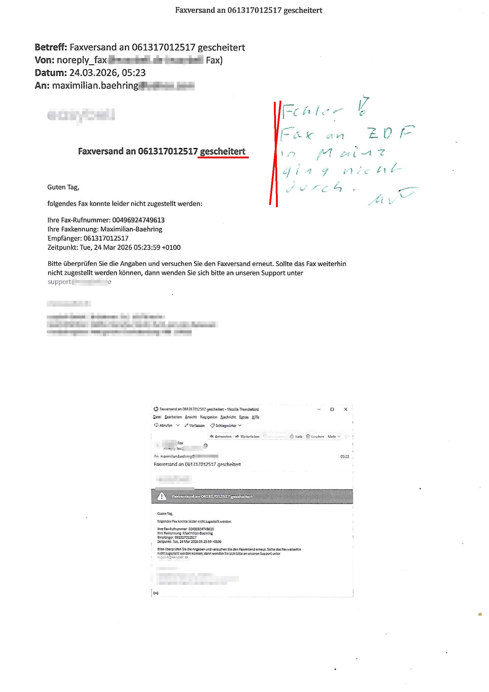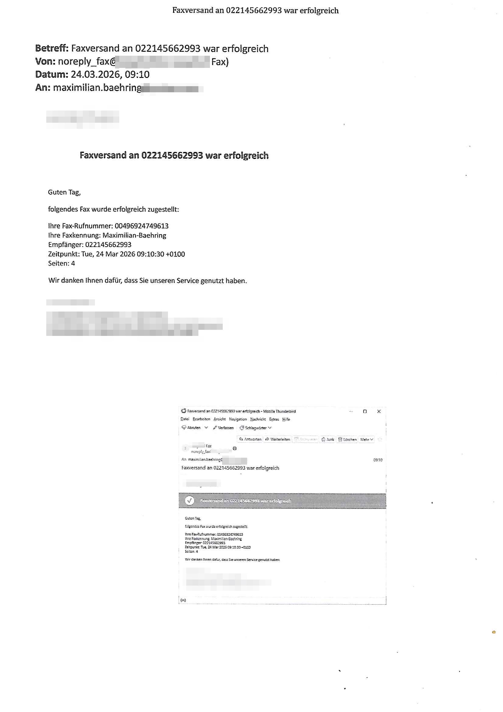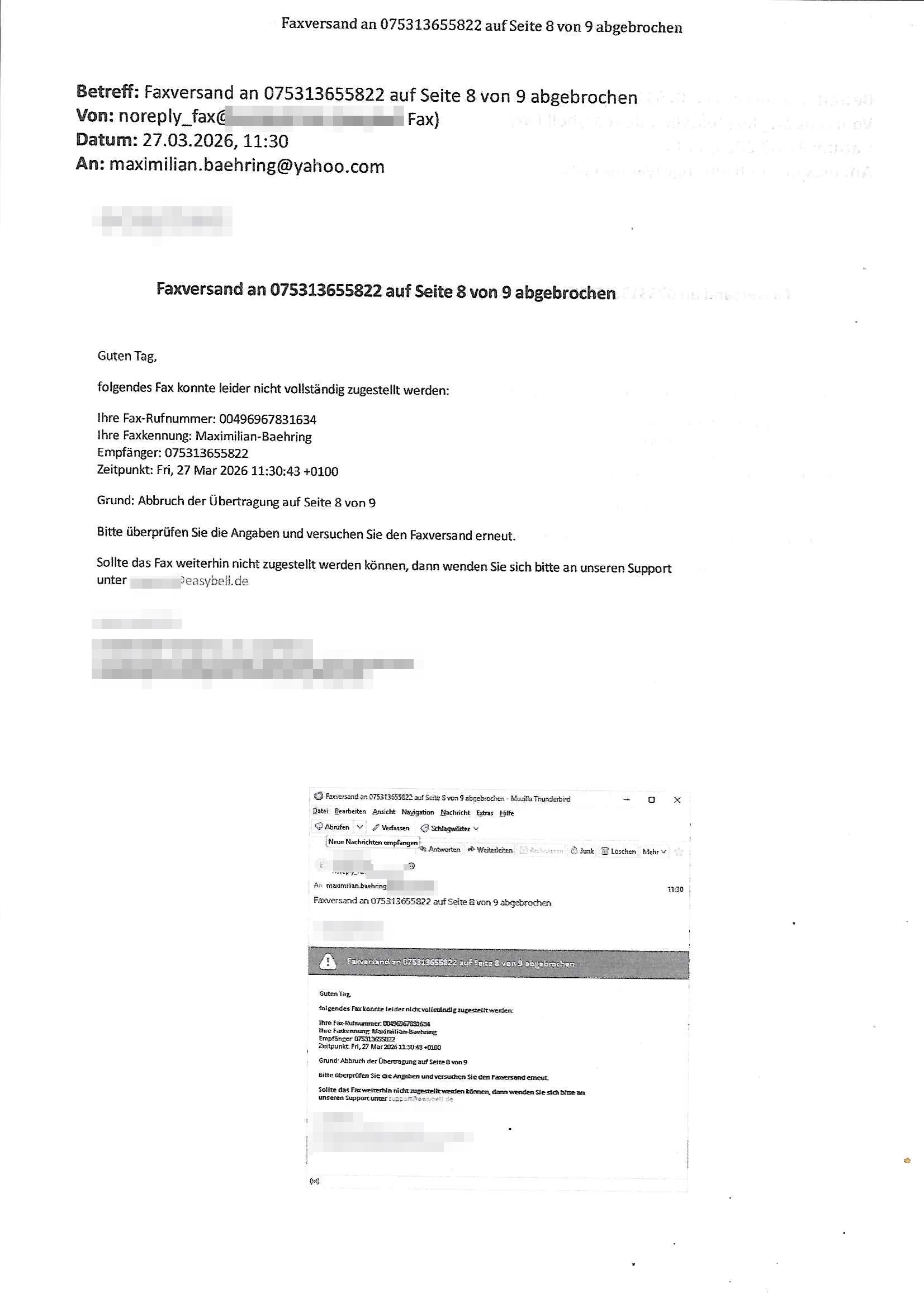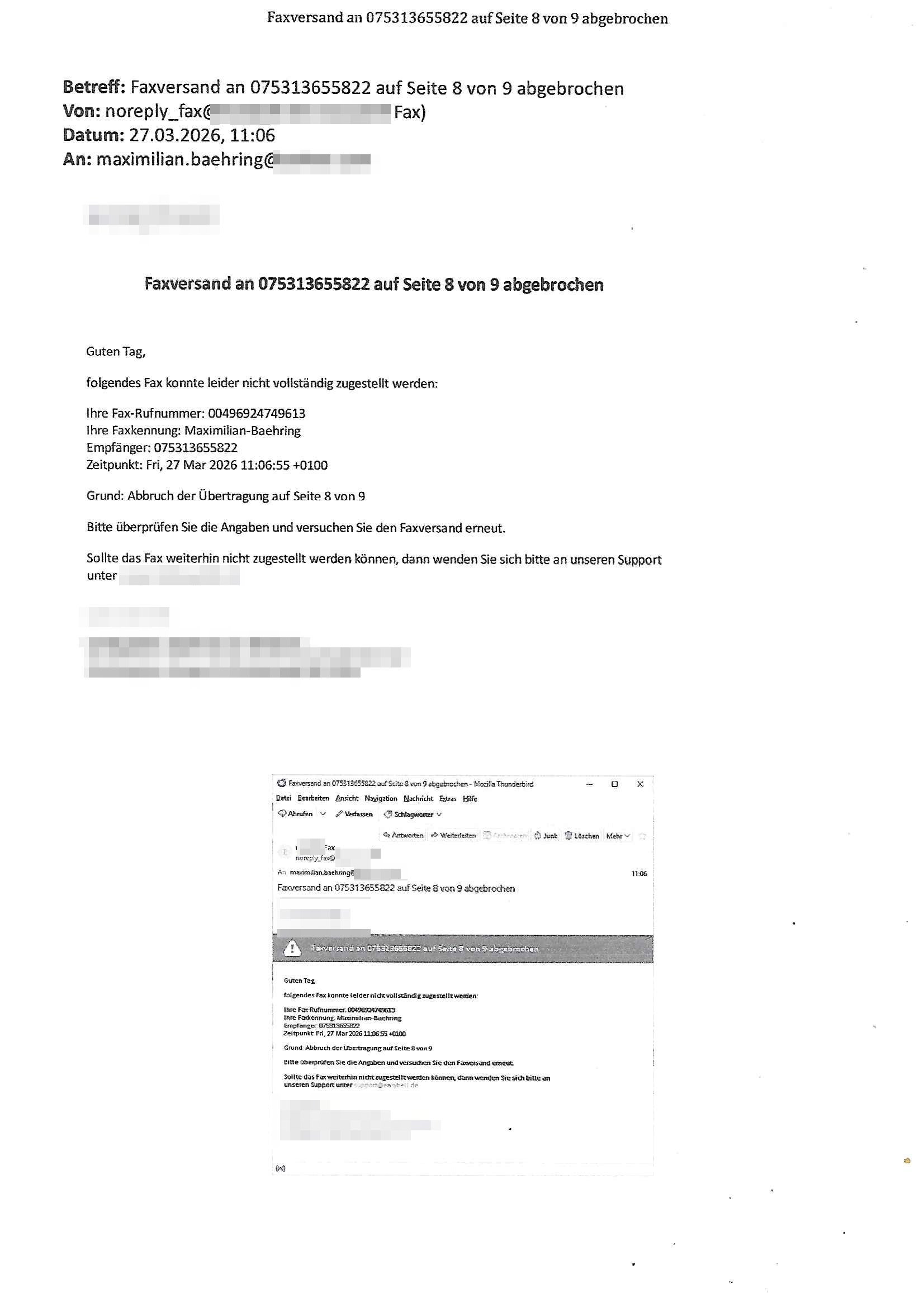 Betreff: Faxversand an 075313655822 auf Seite 8 von 9 abgebrochen Datum: Fri, 27 Mar 2026 10:06:55 +0000 (UTC) Von: Fax <noreply_fax@> An: maximilian.baehring@ Web2Fax Faxversand an 075313655822 auf Seite 8 von 9 abgebrochen Guten Tag, folgendes Fax konnte leider nicht vollständig zugestellt werden: Ihre Fax-Rufnummer: 00496924749613 Ihre Faxkennung: Maximilian-Baehring Empfänger: 075313655822 Zeitpunkt: Fri, 27 Mar 2026 11:06:55 +0100 Grund: Abbruch der Übertragung auf Seite 8 von 9 Bitte überprüfen Sie die Angaben und versuchen Sie den Faxversand erneut. Sollte das Fax weiterhin nicht zugestellt werden können, dann wenden Sie sich bitte an unseren Support unter support@ <mailto:support@> | |