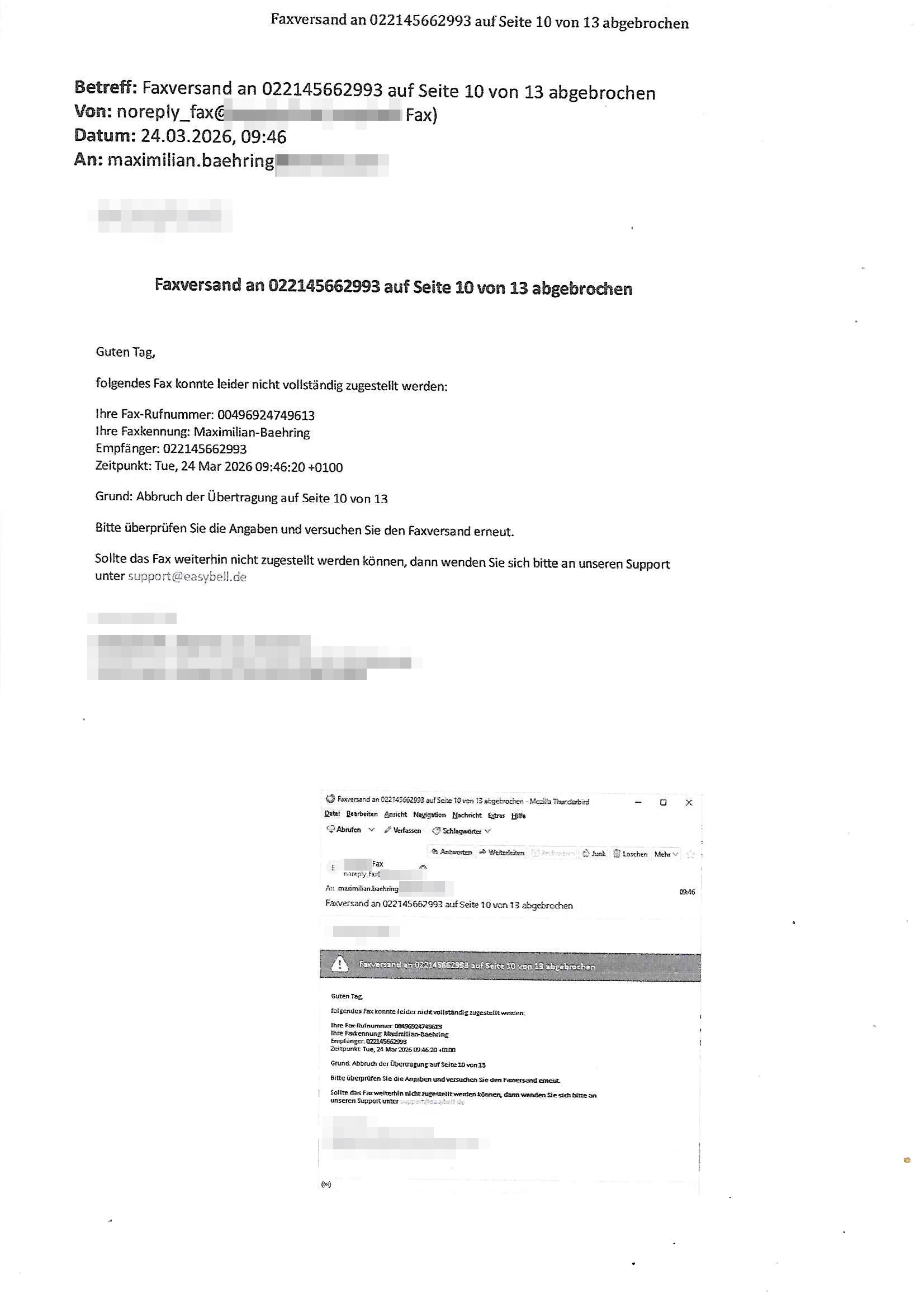 Betreff: Faxversand an 075313655822 auf Seite 8 von 9 abgebrochen Datum: Fri, 27 Mar 2026 10:30:43 +0000 (UTC) Von: Fax <noreply_fax@> An: maximilian.baehring@ Web2Fax Faxversand an 075313655822 auf Seite 8 von 9 abgebrochen Guten Tag, folgendes Fax konnte leider nicht vollständig zugestellt werden: Ihre Fax-Rufnummer: 00496967831634 Ihre Faxkennung: Maximilian-Baehring Empfänger: 075313655822 Zeitpunkt: Fri, 27 Mar 2026 11:30:43 +0100 Grund: Abbruch der Übertragung auf Seite 8 von 9 Bitte überprüfen Sie die Angaben und versuchen Sie den Faxversand erneut. Sollte das Fax weiterhin nicht zugestellt werden können, dann wenden Sie sich bitte an unseren Support unter support@ <mailto:support@> | |