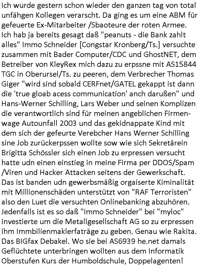 | Ich wurde gestern schon wieder den ganzen tag von total unfähgen Kollegen verarscht. Da ging es um eine ABM für gefeuerte Ex-Mitarbeiter /Sbaoteure der roten Armee. Ich hab ja bereits gesagt daß "peanuts - die Bank zahlt alles" Immo Schneider [Congstar Kronberg/Ts.] versuchte zusammen mit Bader Computer/CDC und GhostNET, dem Betreiber von KleyRex mich dazu zu erpssne mit AS15844 TGC in Oberursel/Ts. zu peeren, dem Verbrecher Thomas Giger "wird sind sobald CERFnet/GATEL gekappt ist dann die 'true gloab acess communication' anch darußen" und Hans-Werner Schilling, Lars Weber und seinen Komplizen die verantwortlich sind für meinen angeblichen Firmen-wage Autounfall 2003 und das gekidnappate Kind mit dem sich der gefeurte Verebcher Hans Werner Schilling sine Job zurückerpssen wollte sow wie sich Sekretärein Brigitta Schössler sich einen Job zu erpressen versucht hatte udn einen einstieg in meine Firma per DDOS/Spam /Viren und Hacker Attacken seitens der Gewerkschaft. Das ist banden udn gewerbsmäßig orgaiserte Kiminalität mit Millionenschäden unterstützt von "RAF Terroristen" also den Luet die versuchten Onlinebanking abzuhören. Jedenfalls ist es so daß "Immo Schneider" bei "myloc" investierte um die Metallgesellschaft AG so zu erpressen ihm Immbilienmaklerfaträge zu geben. Genau wie Rakita. Das BIGfax Debakel. Wo sie bei AS6939 he.net damals Geflüchtete unterbringen wollten aus dem Informatik Oberstufen Kurs der Humboldschule, Doppelagenten!