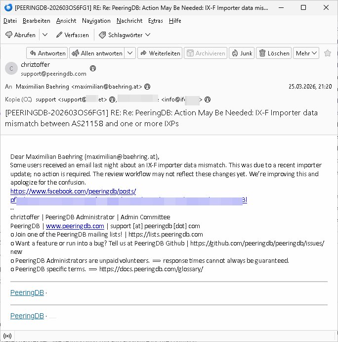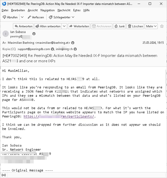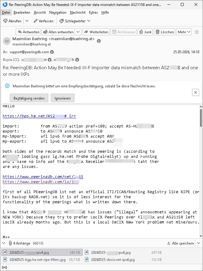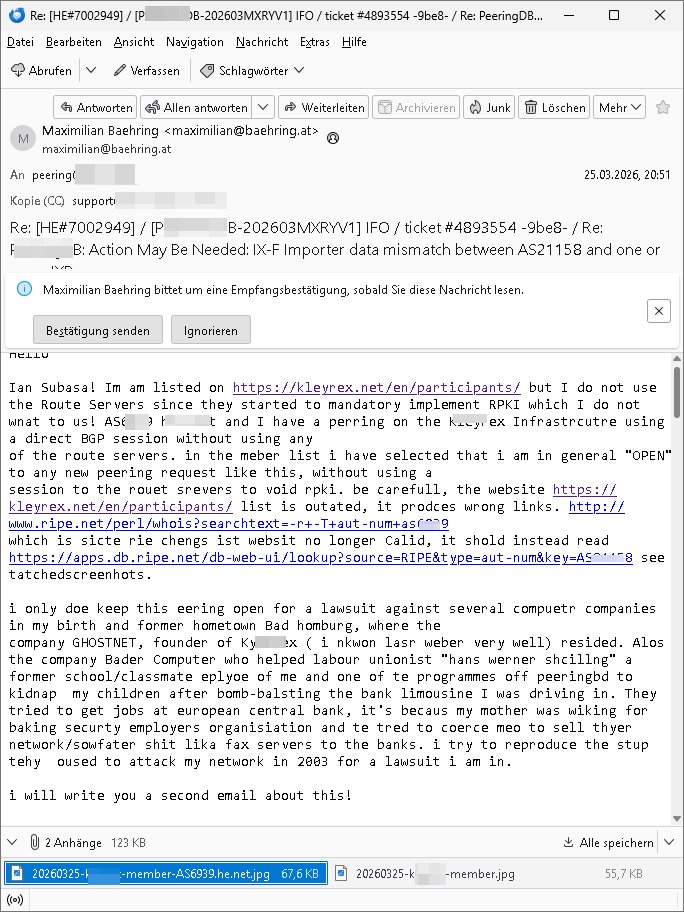 -------- Nachricht -------- Betreff: PeeringDB: Action May Be Needed: IX-F Importer data mismatch between AS2***8 and one or more IXPs Datum: Wed, 25 Mar 2026 06:36:21 +0000 Von: support@peeringdb.com An: maximilian@baehring.at This email details 1 new data mismatch[es] discovered by the PeeringDB IX-F Importer. Please review and correct these mismatches at your PeeringDB network page (https://www.peeringdb.com/asn/2***8 < https://www.peeringdb.com/asn/2***8> ) or work with the indicated IXPs to correct the data. ----------------------------- Data supplied by your network Maximilian Baehring is in conflict with that provided by KleyReX. Please work with KleyReX to resolve this conflict or correct your data at https://www.peeringdb.com/asn/2***8 <https://www.peeringdb.com/asn/2***8> as appropriate. Your network page will contain hints to assist with this. The PeeringDB Admin Committee may assist with this conflict if it is not resolved in a timely manner. MODIFY AS2***8 - 1***2 - 2***1 - ix_side: None to 290 ----------------------------- -------- Nachricht -------- Betreff: Re: PeeringDB: Action May Be Needed: IX-F Importer data mismatch between AS2***8 and one or more IXPs Datum: Wed, 25 Mar 2026 14:10:20 +0100 Von: Maximilian Baehring <maximilian@baehring.at> An: support@peeringdb.com Kopie (CC): support@h***t, info@i***h Hello https://bgp.he.net/AS2***8#_irr import: from AS6***9 action pref=100; accept AS-HURRICANE export: to AS6***9 announce AS2***8 mp-import: afi ipv6 from AS6***9 accept ANY mp-export: afi ipv6 to AS6***9 announce AS2***8 both sides of the records match and the peering is (according to AS39389 looking gass lg.he.net Probe Digtalreliyt) up and running and i have no info aof the KleyRex Reseller AS34927 IFOG taht ther are any issues. https://www.peeringdb.com/net/7***5 https://www.peeringdb.com/ix/1**3 first of all PEeeringDB ist not an official ITI/ICAN/Routing Registry like RIPE (or its backup RADB.net) so it is of less interest for the functionality of the peerings what is written down there. i know that AS6***9 h***t H***E has issues ("illegal" annoucmnets appearing at NEW YORK) becasue they try to prefer L***X Peerings over K**x and AS2***8 left L***X already months ago. But this is a local DeCIX New York problem not mine/ours. Max Am 25.03.2026 um 07:36 schrieb support@peeringdb.com: [...] -------- Nachricht -------- Betreff: [HE#7002949] Re: PeeringDB: Action May Be Needed: IX-F Importer data mismatch between AS2***8 and one or more IXPs Datum: Wed, 25 Mar 2026 11:15:25 -0700 Von: Ian Subasa <peering@***> Antwort an: peering@*** An: Maximilian Baehring <maximilian@baehring.at> Kopie (CC): support@peeringdb.com, info@i***h Hi Maximilian, I don't think this is related to HE/AS6***9 at all. It looks like you're responding to an email from PeeringDB. It looks like they are receiving a JSON feed from *** that indicates what networks are assigned which IPs and they see a mismatch between that data and what's listed on your PeeringDB page for AS2***8. This would not be data from or related to HE/AS6***9. For what it's worth the Participants page on the *** website appears to match the IP you have listed on PeeringDB: https://***/en/participants/. I think we can be dropped from further discussion as it does not appear we should be involved. Thank you, Ian Subasa Sr. Network Engineer *** AS6***9 Provisioning Department *** -------- Nachricht -------- Betreff: Re: [HE#7002949] / [PEERINGDB-202603MXRYV1] IFO / ticket #4893554 -9be8- / Re: PeeringDB: Action May Be Needed: IX-F Importer data mismatch between AS2***8 and one or more IXPs Datum: Wed, 25 Mar 2026 20:51:40 +0100 Von: Maximilian Baehring <maximilian@baehring.at> An: peering@*** Kopie (CC): support@peeringdb.com Hello Ian Subasa! Im am listed on https://k****t/en/participants/ but I do not use the Route Servers since they started to mandatory implement RPKI which I do not wnat to us! AS6***9 h***t and I have a perring on the K***x Infrastrcutre using a direct BGP session without using any of the route servers. in the meber list i have selected that i am in general "OPEN" to any new peering request like this, without using a session to the rouet srevers to void rpki. be carefull, the website https://k***/en/participants/ list is outated, it prodces wrong links. http://www.ripe.net/perl/whois?searchtext=-r+-T+aut-num+AS6***9 which is sicte rie chengs ist websit no longer Calid, it shold instead read https://apps.db.ripe.net/db-web-ui/lookup?source=RIPE&type=aut-num&key=AS2***8 see tatchedscreenhots. i only doe keep this eering open for a lawsuit against several compuetr companies in my birth and former hometown Bad homburg, where the company GHOSTNET, founder of Kylerex ( i nkwon lasr weber very well) resided. Alos the company Bader Computer who helped labour unionist "hans werner shcillng" a former school/classmate eplyoe of me and one of te programmes off peeringbd to kidnap my children after bomb-balsting the bank limousine I was driving in. They tried to get jobs at european central bank, it's becaus my mother was wiking for baking securty employers organisiation and te tred to coerce meo to sell thyer network/sowfater shit lika fax servers to the banks. i try to reproduce the stup tehy oused to attack my network in 2003 for a lawsuit i am in. i will write you a second email about this! Max -------- Nachricht -------- Betreff: [PEERINGDB-202603OS6FG1] RE: Re: PeeringDB: Action May Be Needed: IX-F Importer data mismatch between AS2***8 and one or more IXPs Datum: Wed, 25 Mar 2026 20:20:25 +0000 (UTC) Von: chriztoffer <support@peeringdb.com> Antwort an: chriztoffer <support@peeringdb.com> An: Maximilian Baehring <maximilian@baehring.at> Kopie (CC): support <support@***>, Ruben Garbade <info@i***h> ? Dear Maximilian Baehring (maximilian@baehring.at), Some users received an email last night about an IX-F importer data mismatch. This was due to a recent importer update; no action is required. The review workflow may 