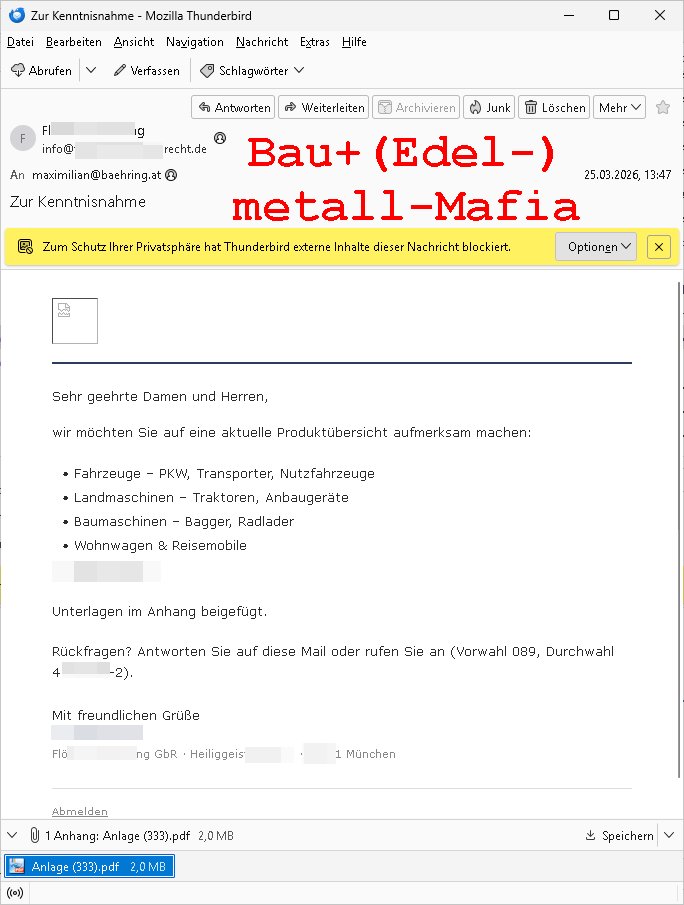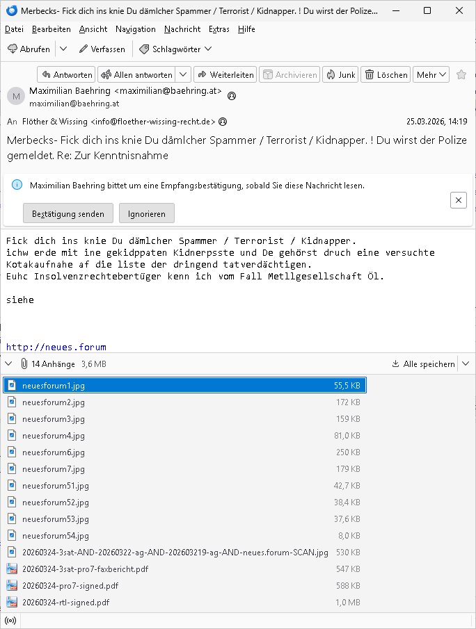-------- Nachricht -------- Betreff: Zur Kenntnisnahme Datum: Wed, 25 Mar 2026 12:47:33 +0000 Von: F***g <info@***-recht.de> An: maximilian@baehring.at Sehr geehrte Damen und Herren, wir möchten Sie auf eine aktuelle Produktübersicht aufmerksam machen: * Fahrzeuge – PKW, Transporter, Nutzfahrzeuge * Landmaschinen – Traktoren, Anbaugeräte * Baumaschinen – Bagger, Radlader * Wohnwagen & Reisemobile * Edelmetalle Unterlagen im Anhang beigefügt. Rückfragen? Antworten Sie auf diese Mail oder rufen Sie an (Vorwahl 089, Durchwahl 4143390-2). Mit freundlichen Grüße M. M***s F***R · H*** · M***n Abmelden <mailto:abmelden@***recht.de> -------- Nachricht -------- Betreff: Merbecks- Fick dich ins knie Du dämlcher Spammer / Terrorist / Kidnapper. ! Du wirst der Polize gemeldet. Re: Zur Kenntnisnahme Datum: Wed, 25 Mar 2026 14:19:18 +0100 Von: Maximilian Baehring <maximilian@baehring.at> An: *** <info@***recht.de> Fick dich ins knie Du dämlcher Spammer / Terrorist / Kidnapper. ichw erde mit ine gekidppaten Kidnerpsste und De gehörst druch eine versuchte Kotakaufnahe af die liste der dringend tatverdächtigen. Euhc Insolvenzrechtebertüger kenn ich vom Fall Metllgesellschaft Öl. siehe http://neues.forum ... | |